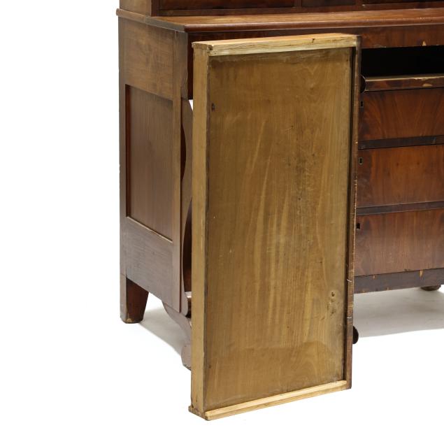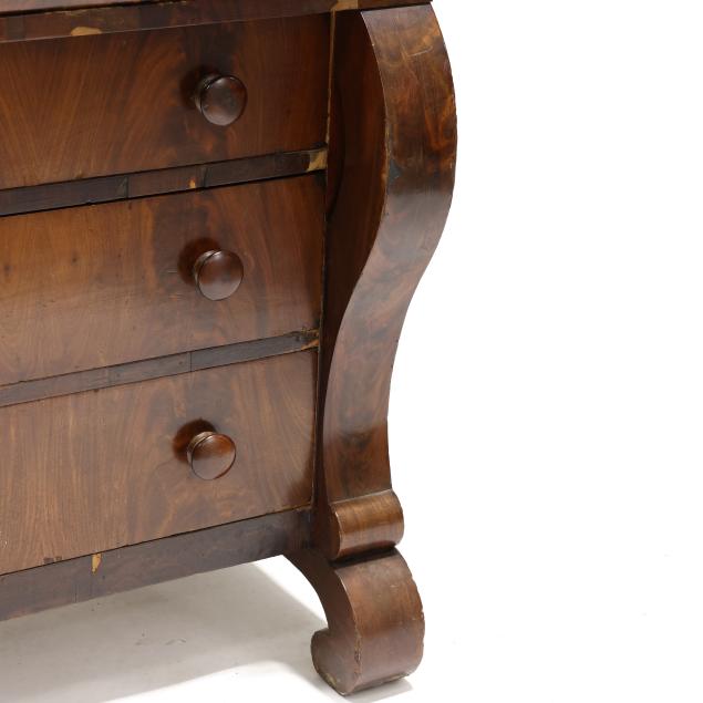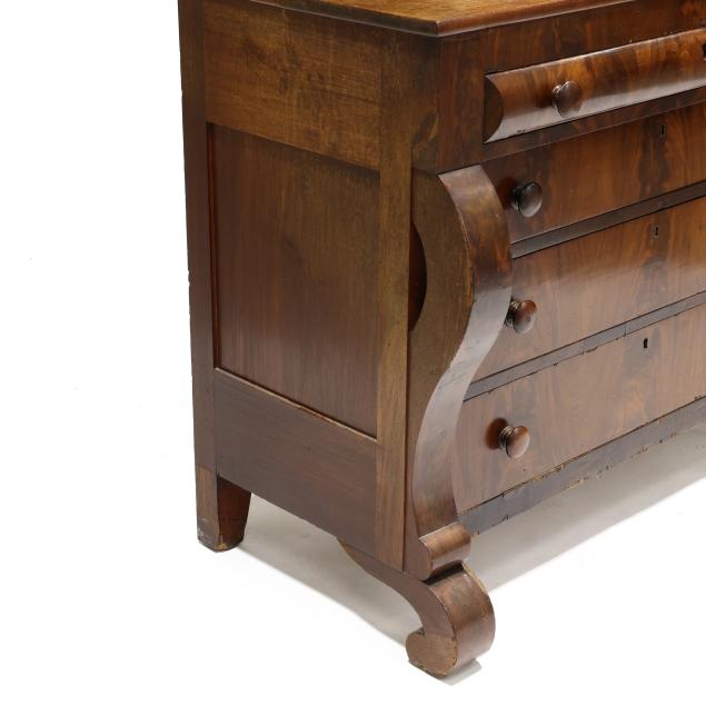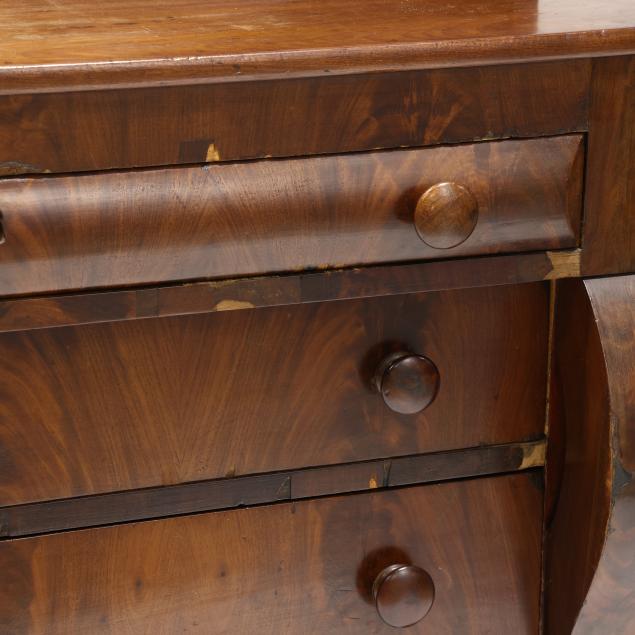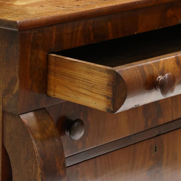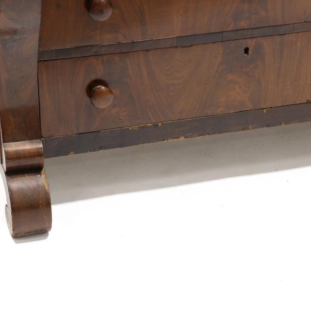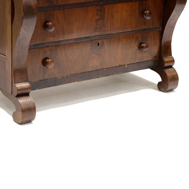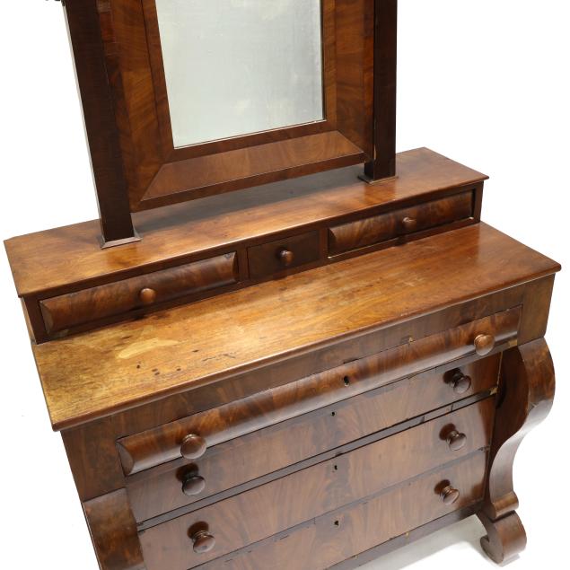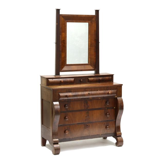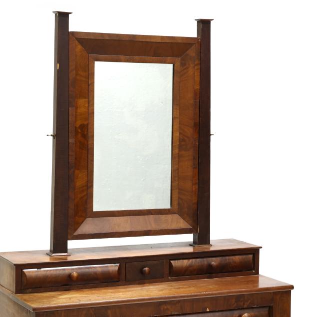 Circa 1840, mahogany veneer, walnut, poplar and yellow pine secondary, rectangular mirror with paneled frame supported by tapered stiles, over a stepped compartment with two convex drawers flanking a small flush drawer, the case with an upper convex drawer over three recessed graduated flush drawers flanked by S-scrolled stiles, scrolled front feet, paneled sides, straight rear legs.