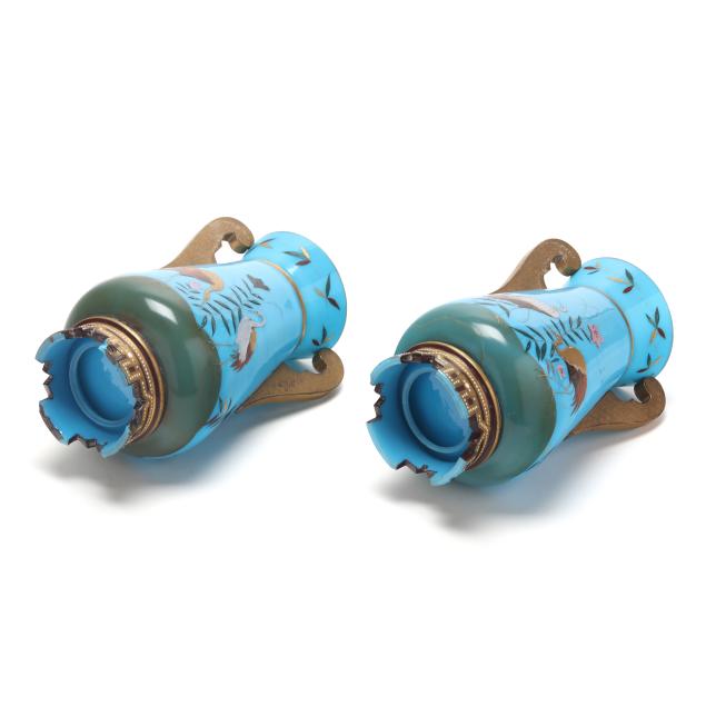 Both with paint and gilt rubbing; one vase with one handle no longer fixed to vase with metal mounts, now glued to vase, several breaks and repairs to feet; the other with break and repair to base and small chip to one foot.