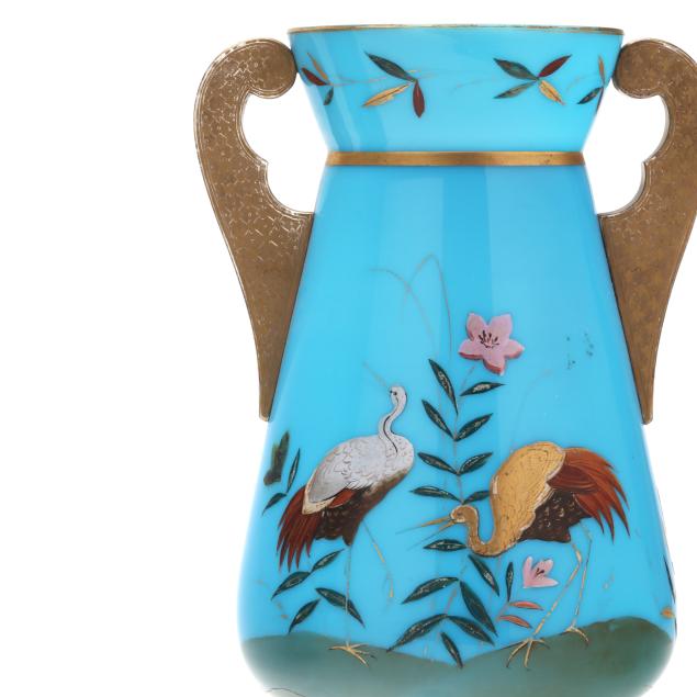 Early 20th century, likely French, each with polychrome hand-painted decoration featuring two cranes to body, two gilt brass handles with bas-relief diapering, and geometric patterned four footed base, unmarked.