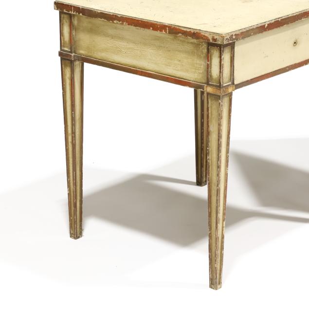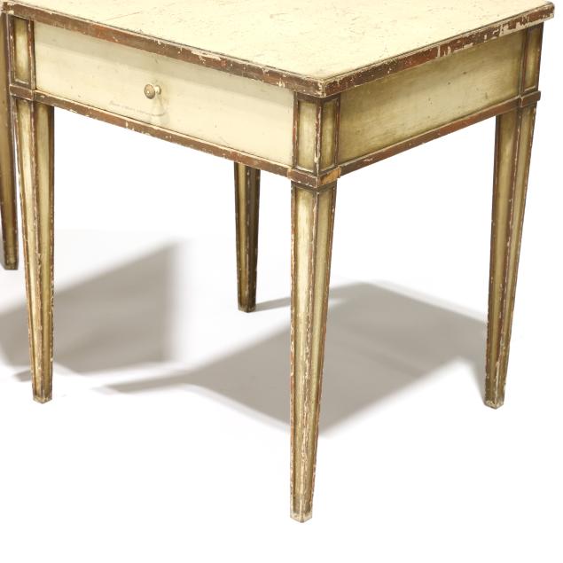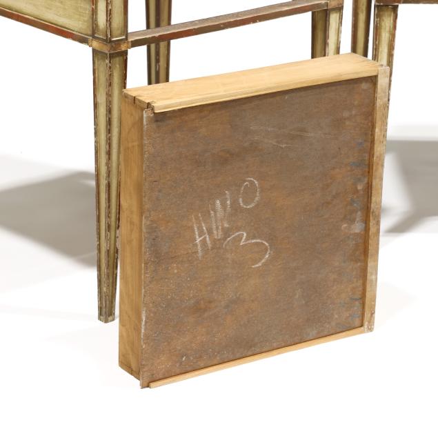 Mid-20th century, antiqued painted wood with gilt highlights, paneled tapered legs.