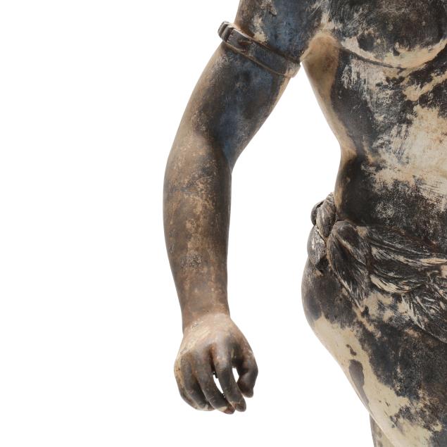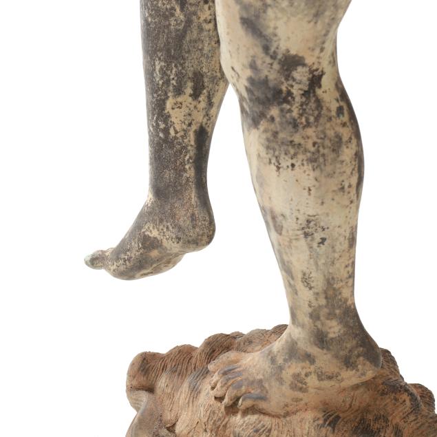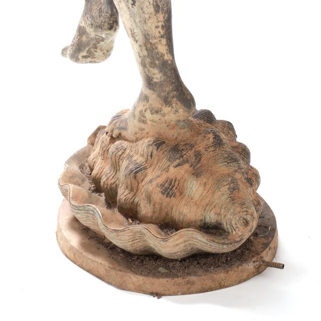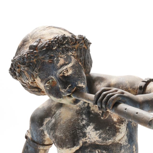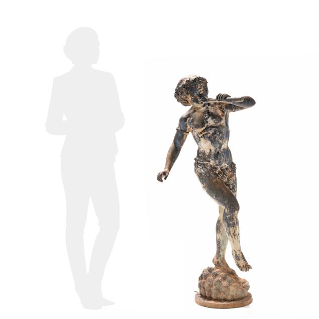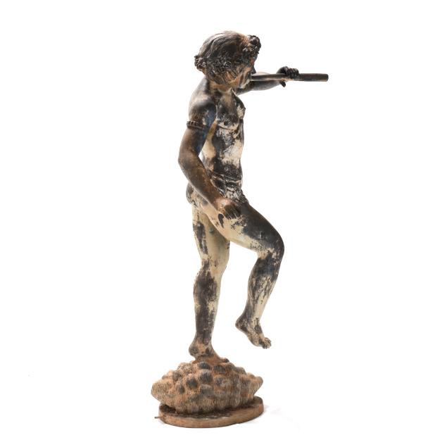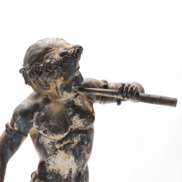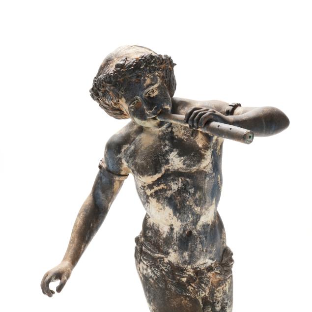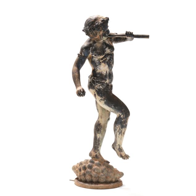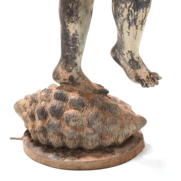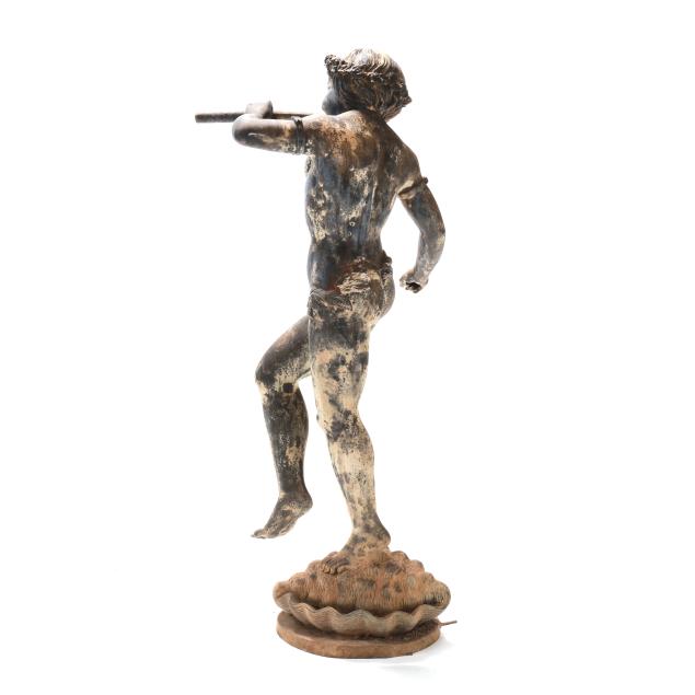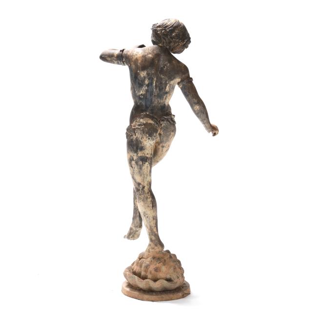 Second half 20th century, approximately life size, patinated bronze, representing a youthful Bacchus dancing on a conch shell while playing his instrument, unsigned.