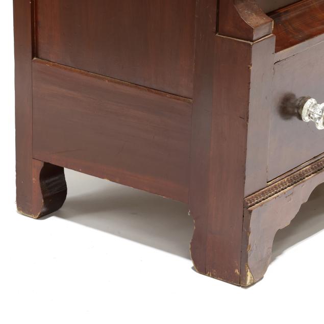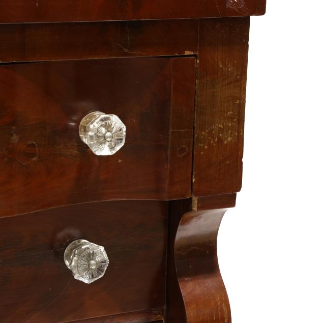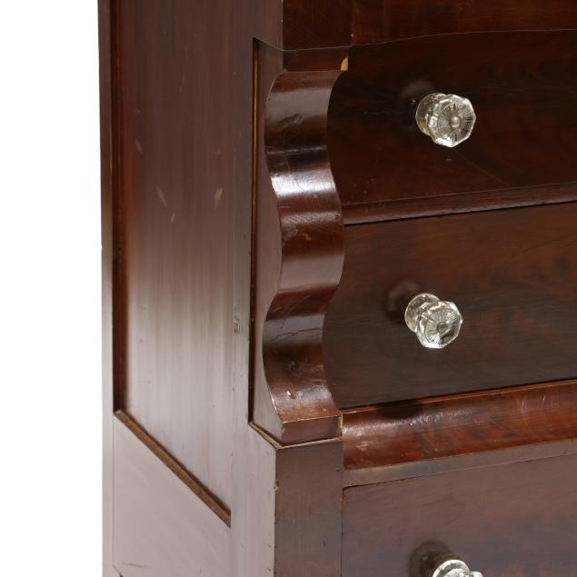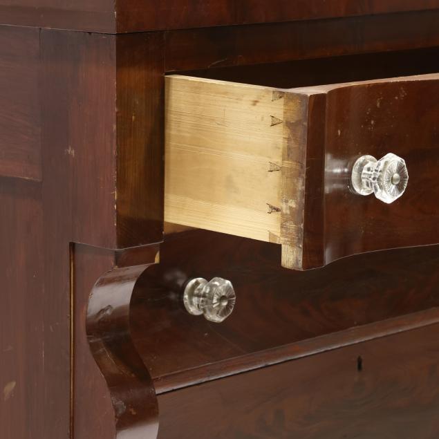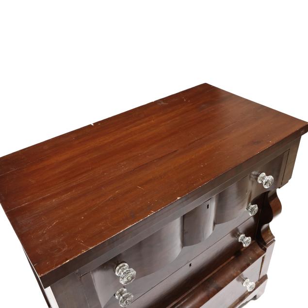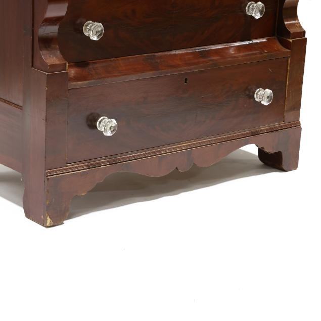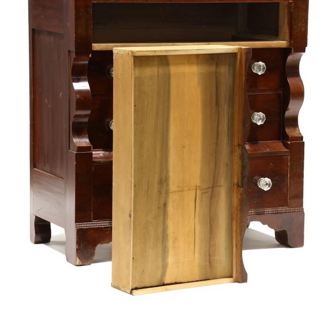 Circa 1840, mahogany veneer, poplar secondary, upper stylized "bookpage" drawer over two recessed drawers over a lower projecting drawer, scrolled stiles.