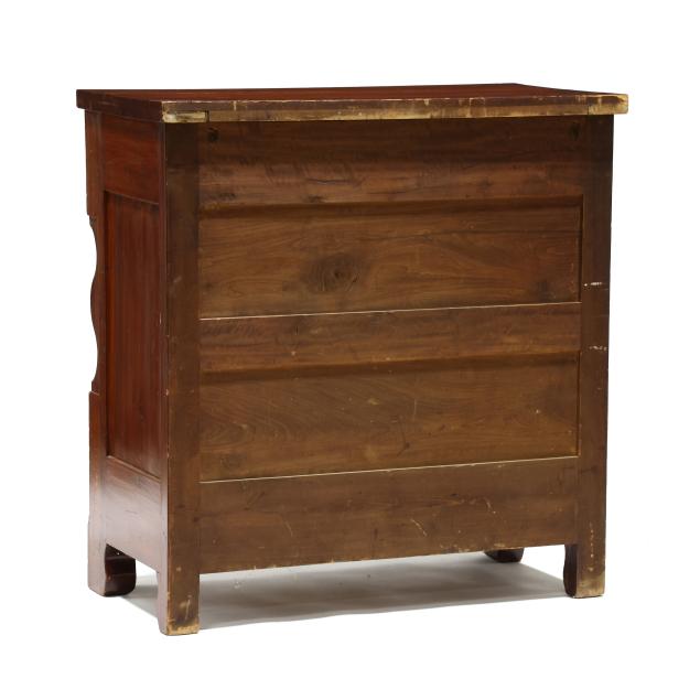 Fair condition; the top likely missing original mahogany veneer, now in poplar with dark stain; plug holes and horizontal spline to top (from shrinkage crack fill); old but later pulls; small veneer chips.