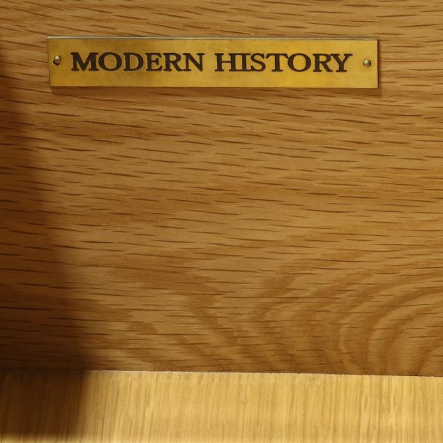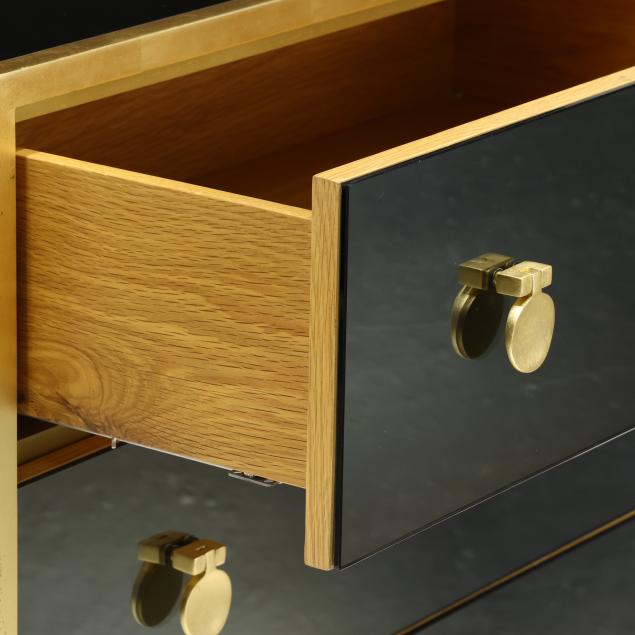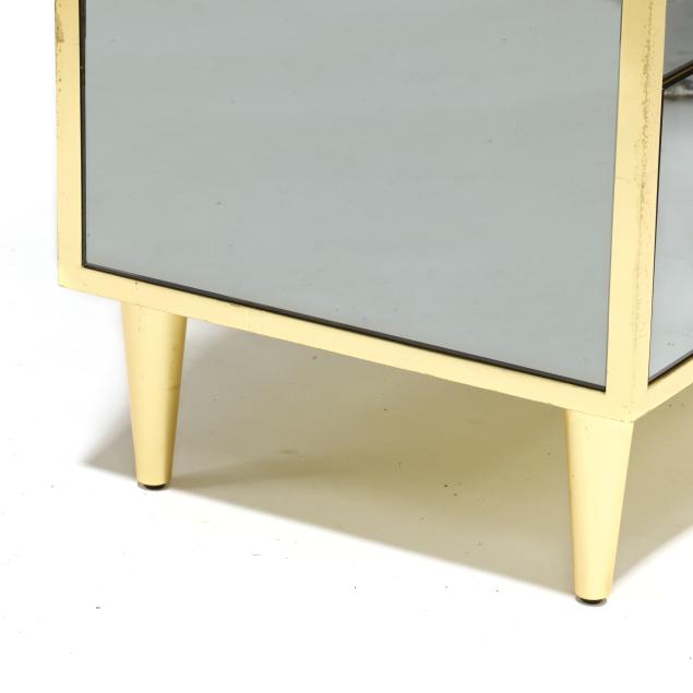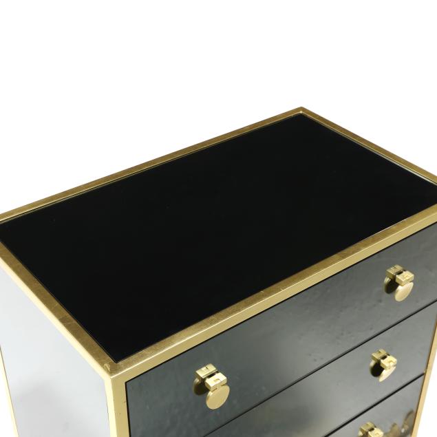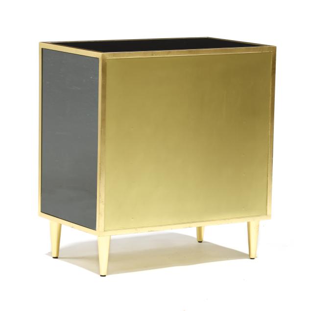 Contemporary, gunmetal tone mirrored panels with gold leaf frame and pulls, consisting of three drawers, recessed turned tapered feet, labeled.