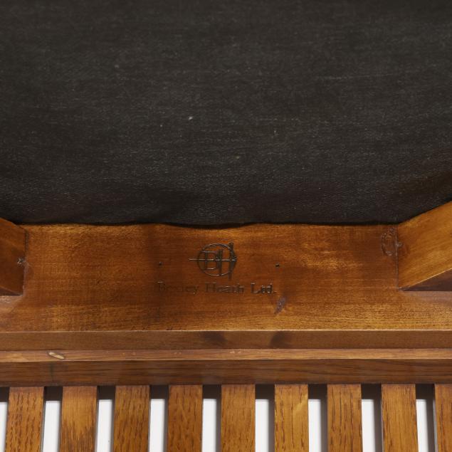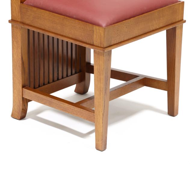 Late 20th century production by Bexley Heath, after the original which was produced in 1902, quarter sawn oak, tall open slat back, red leather upholstered slip seat, tapered legs, stretcher base, labeled.