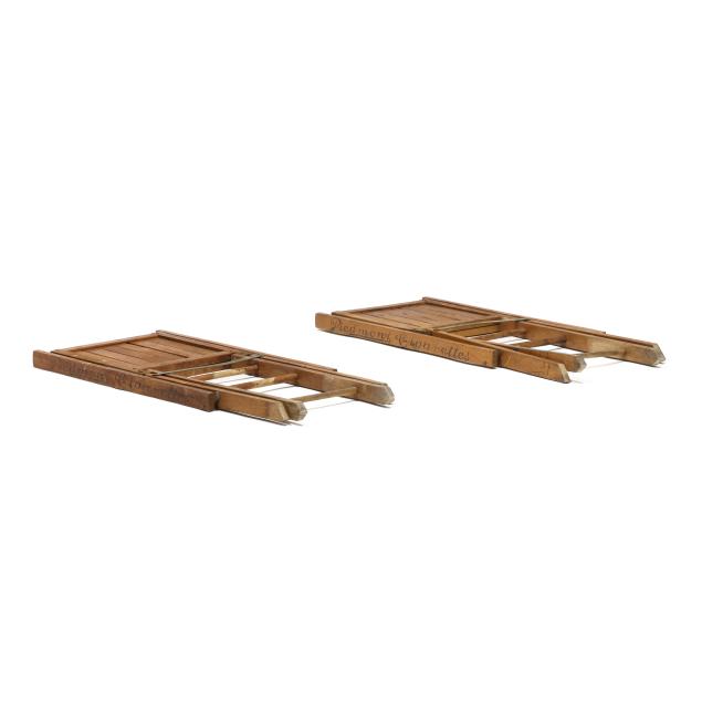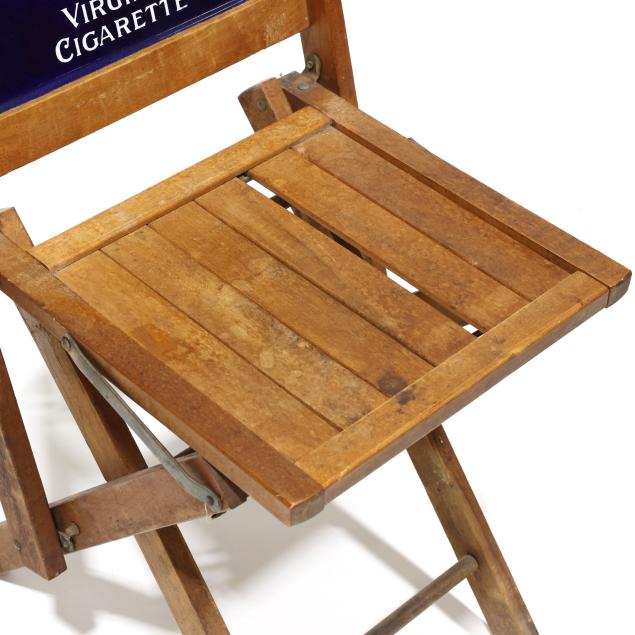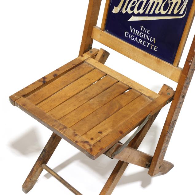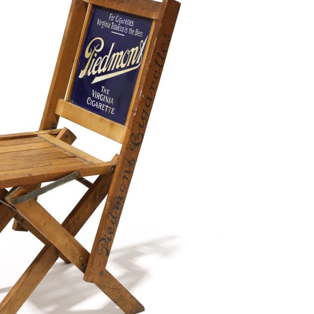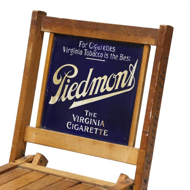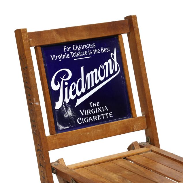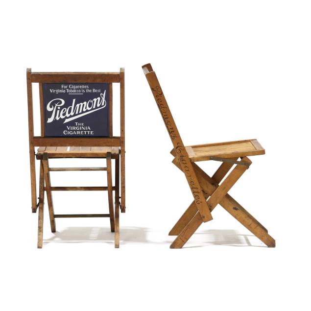 Early 20th century, folding wood frames with enameled double sided advertisement to back, chair stiles also stenciled for "Piedmont Cigarettes."