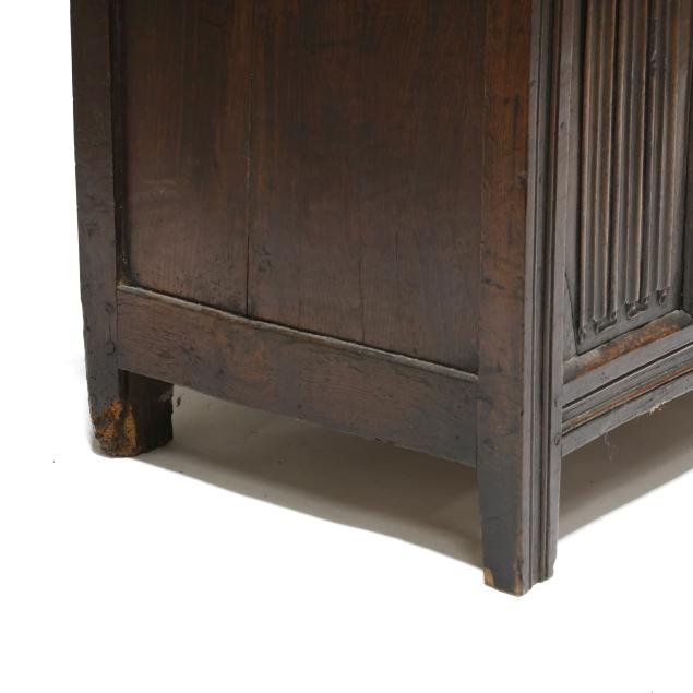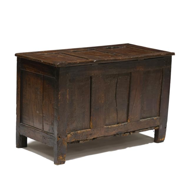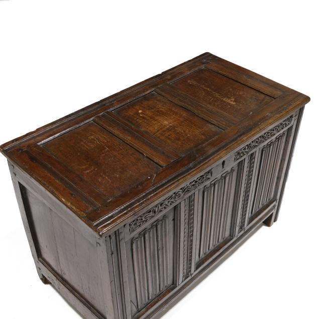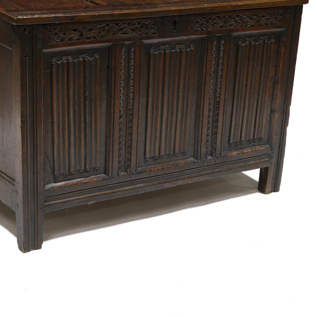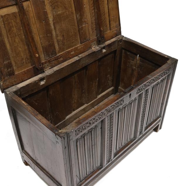 17th century, triple paneled lid with molded surrounds, open interior, the front of the case with three linen fold panels and Gothic motif frieze, paneled sides, straight legs.
