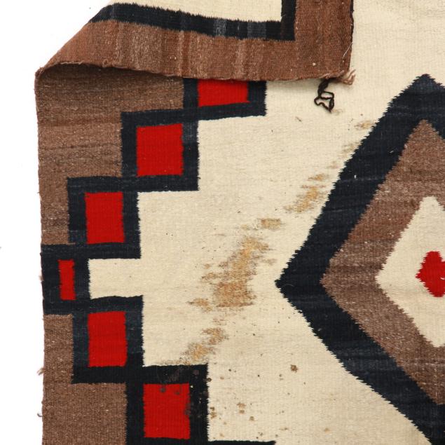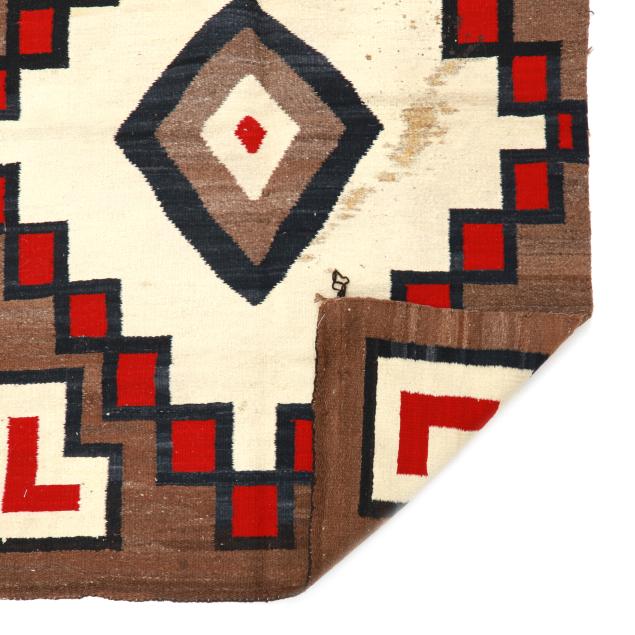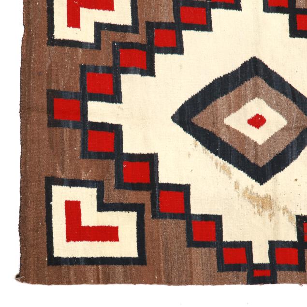 Wool, with center diamond motif in red, brown, and black, on cream field, with geometric red and black motifs.