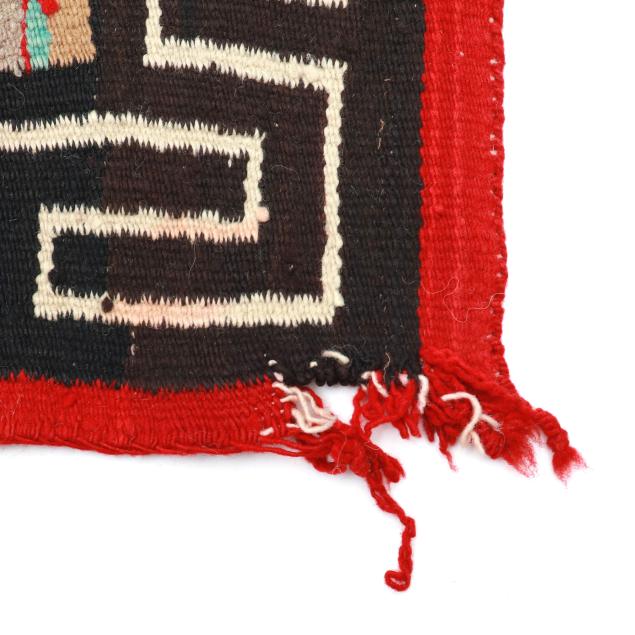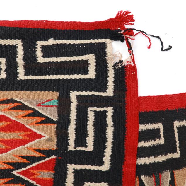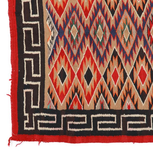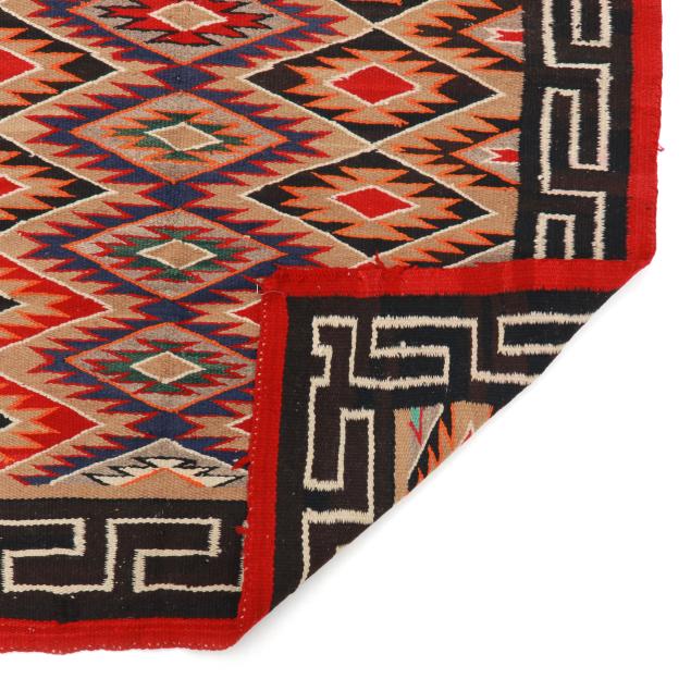 Wool, the center field of multicolored repeating diamond motifs in radiating sawtooth borders, with main black border with greek key motif, with red outer border.