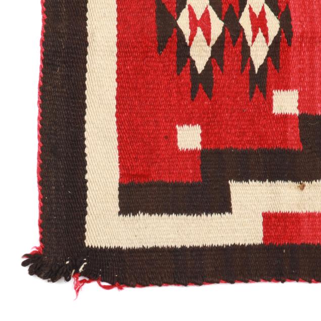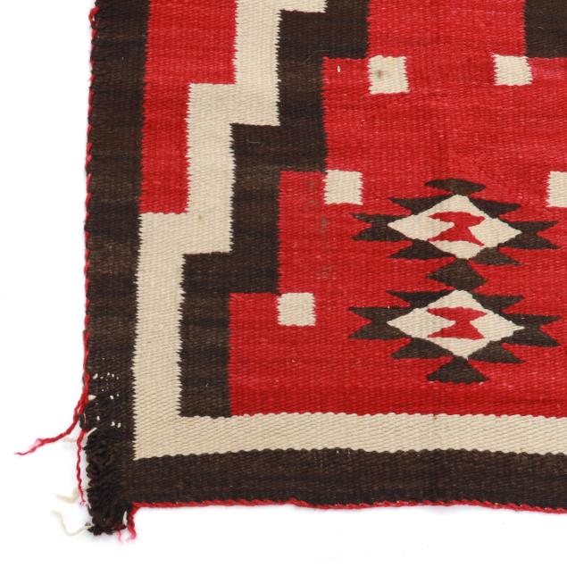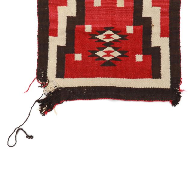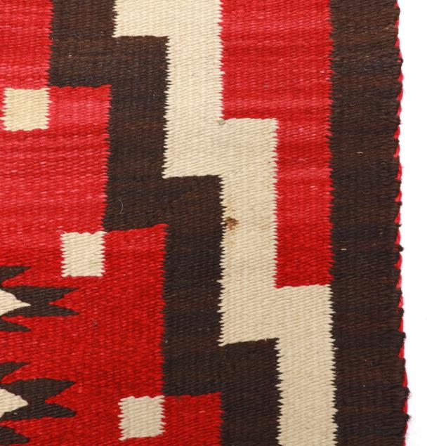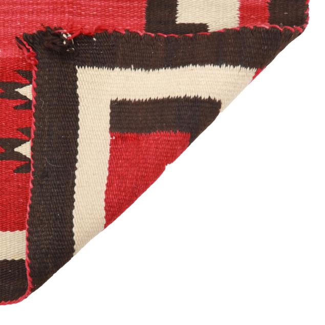 Wool, with large scale X-shaped storm motif emanating from center in brown and cream, on red field, with sawtooth diamond motifs to each end.