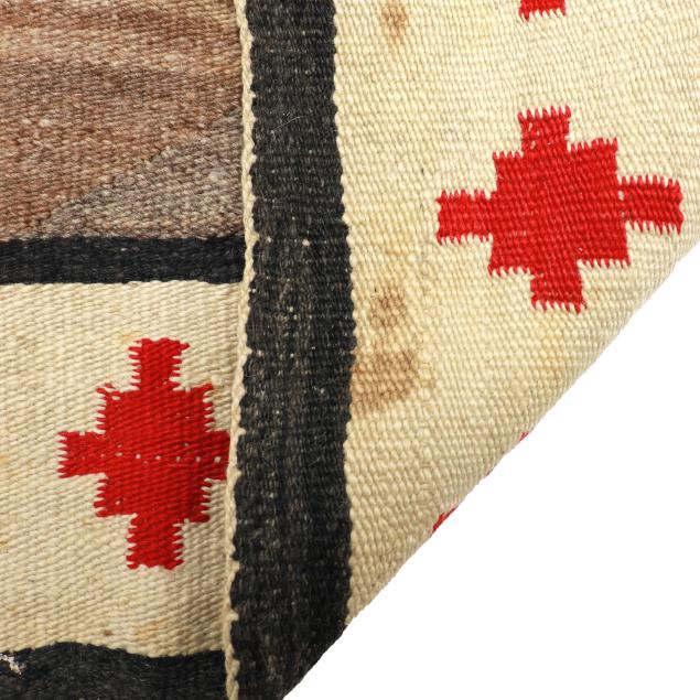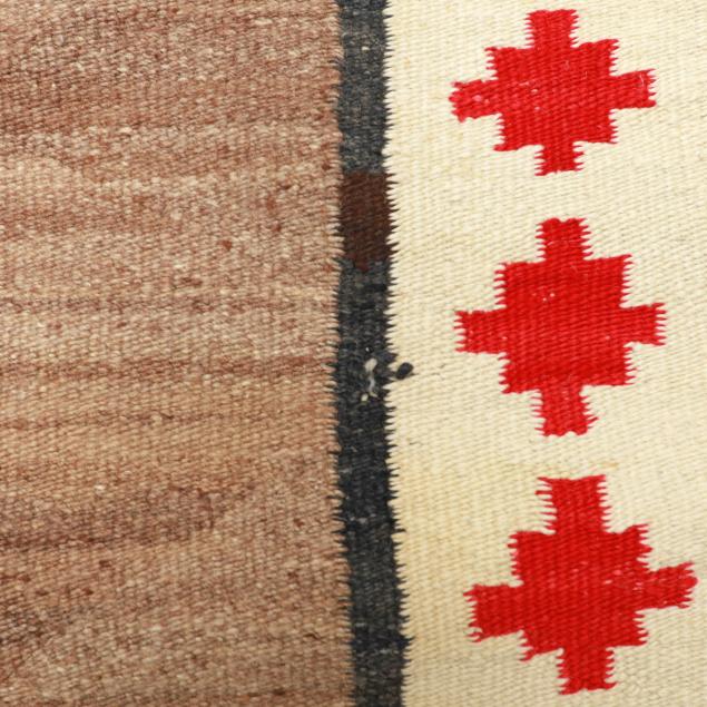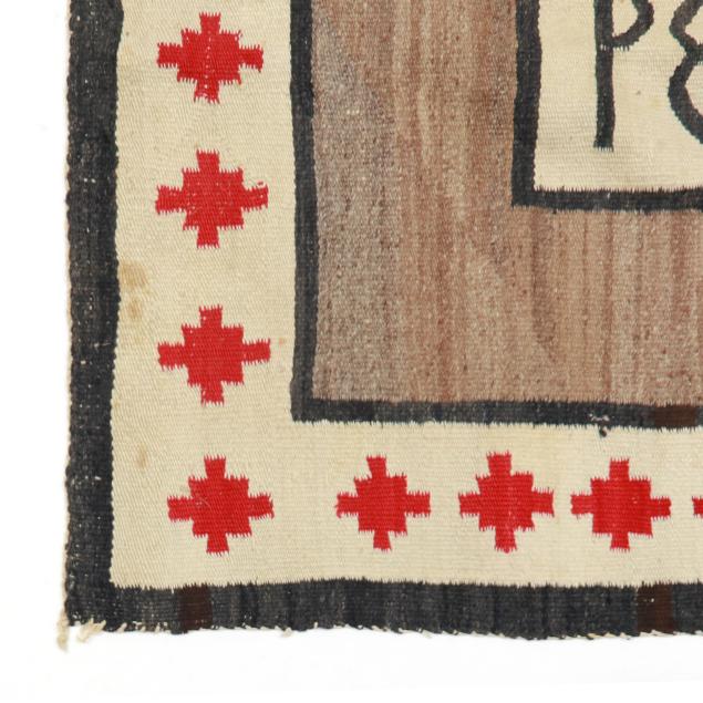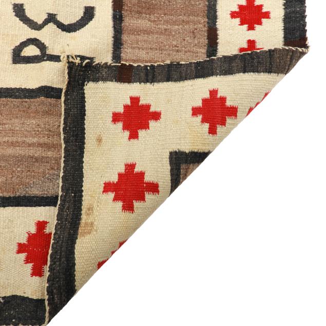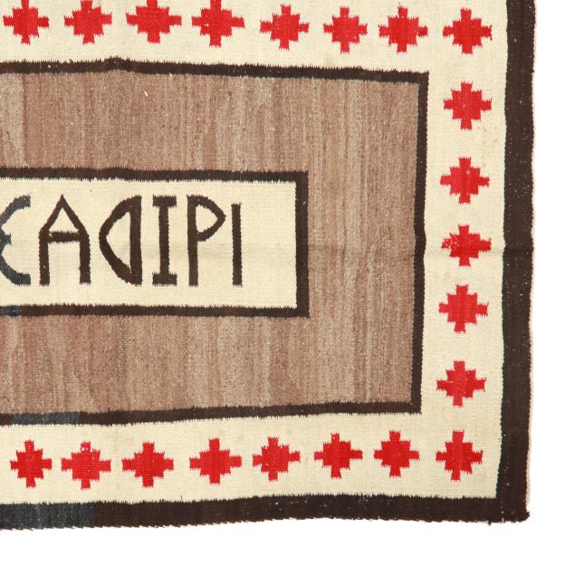 Wool, with word in central rectangular motif, on taupe field, with cream border of repeating red geometric motifs.