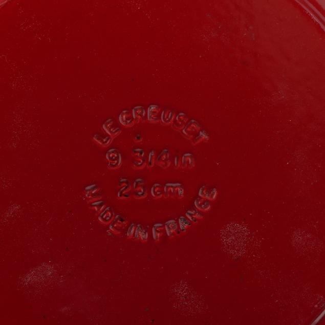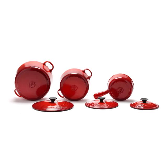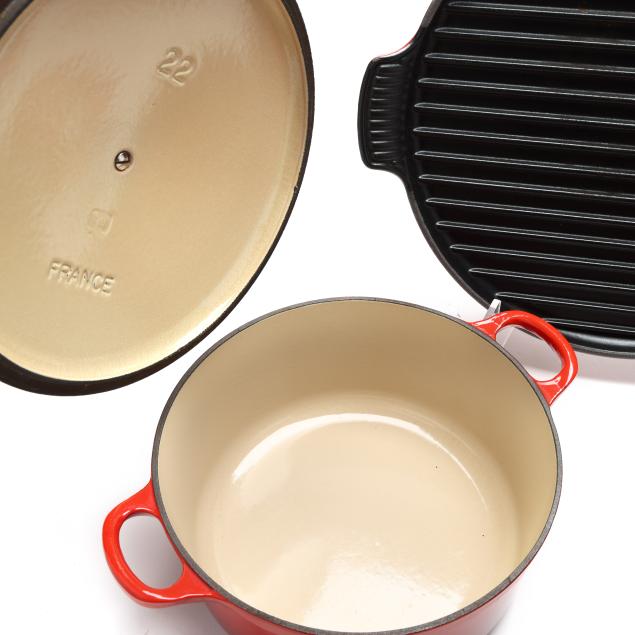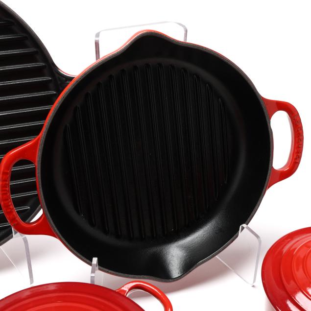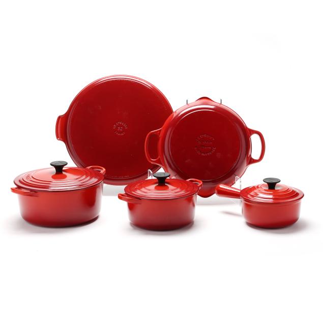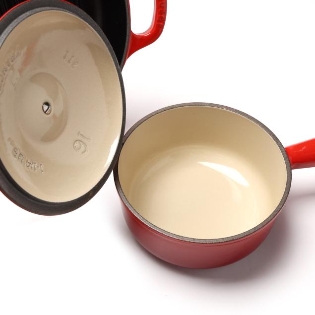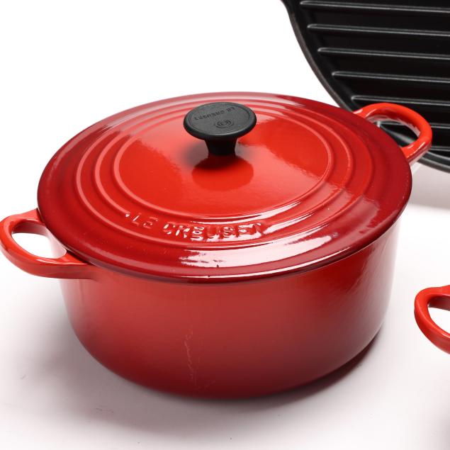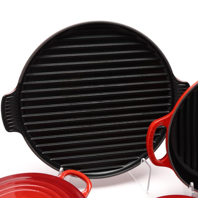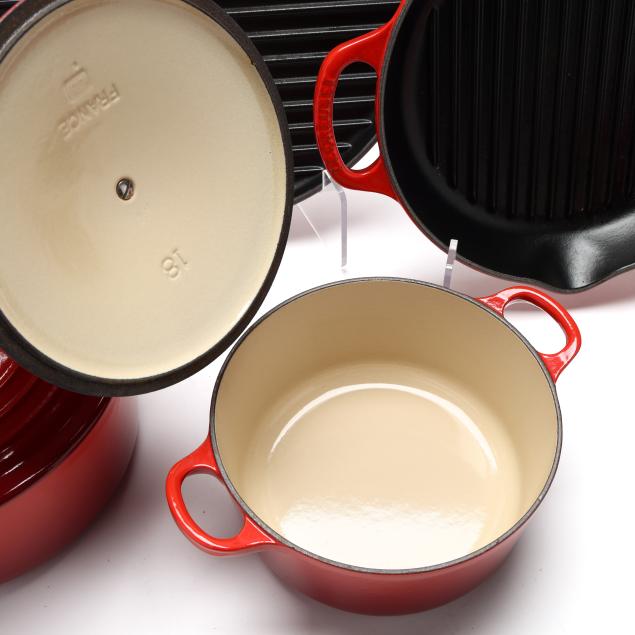 Including a sauce pan with lid (16 cm), (2) round Dutch ovens with covers (2 quart and 3.5 quart sizes), round griddle (32 cm) and round skillet with griddle surface (25 cm).
