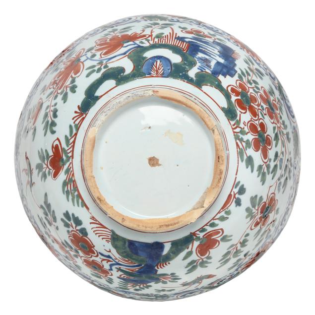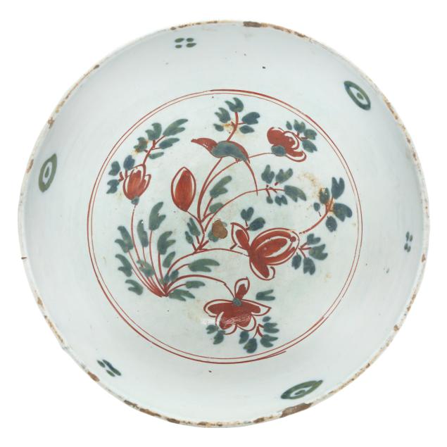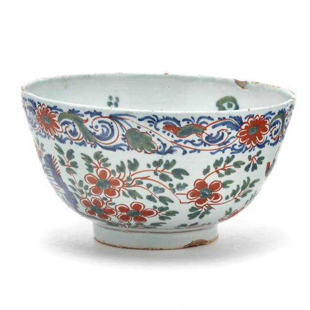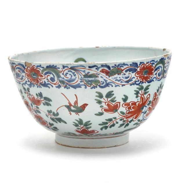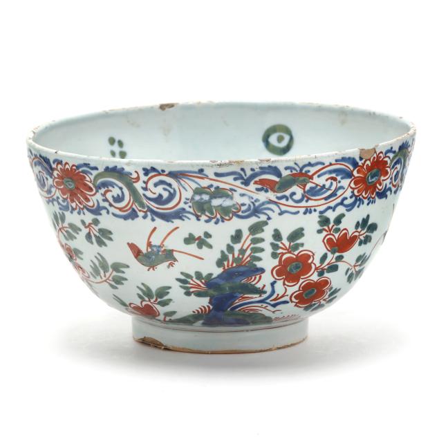 Early 18th century, possibly Bristol, tin-glazed earthenware hand-painted polychrome, of round form with conforming foot, exterior decorated in bird with flowering arabesque borders, interior with central bird on branch design, unsigned.