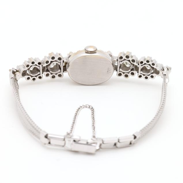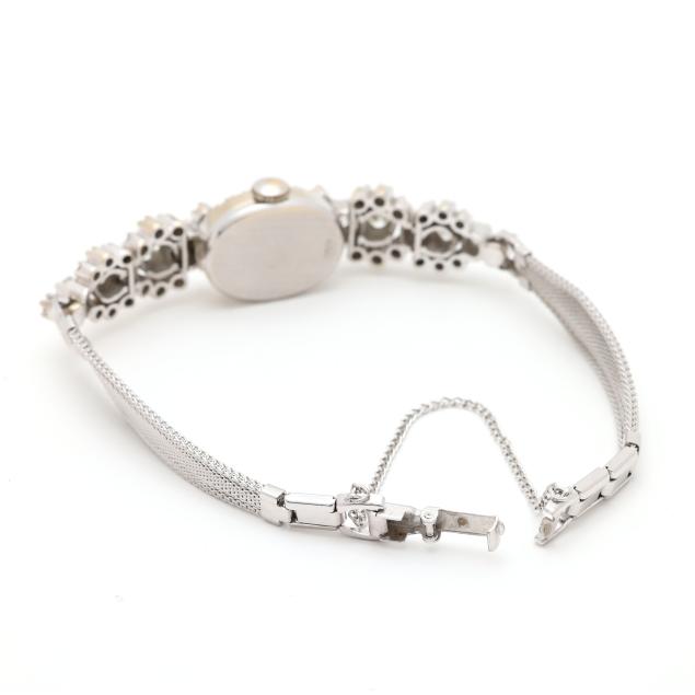 Manual wind, Hamilton 761, the white gold oval case with single cut diamond surround, and set with full cut round and single cut diamonds to the lugs, the signed white dial with Arabic numeral hour markers and silver-tone alpha hands, the mesh strap completed with fold over clasp and safety chain XRF testing base metal, the caseback stamped 14K Gold. The total diamond weight is approximately 2.65 carats (H-I color, SI2-I1 clarity).