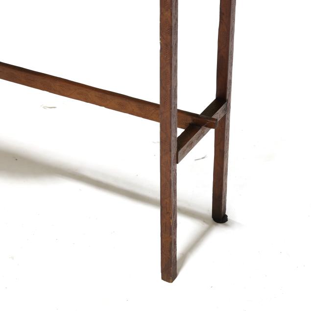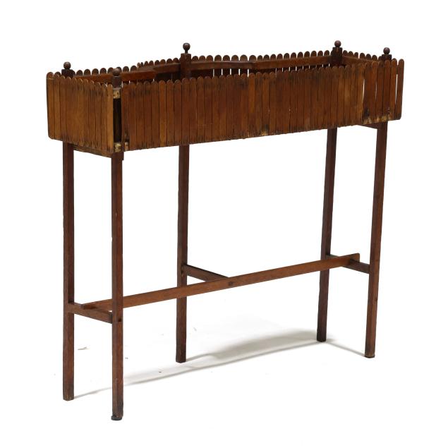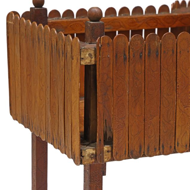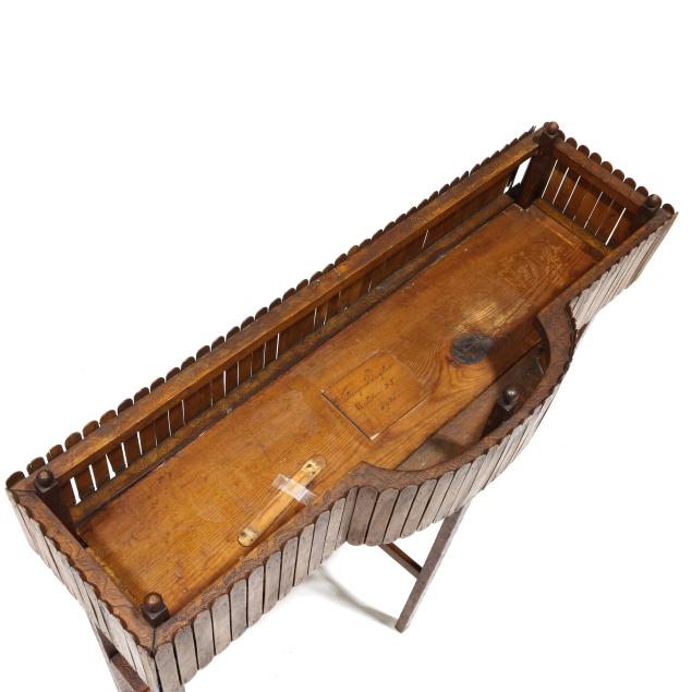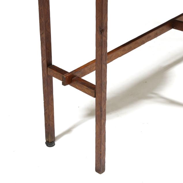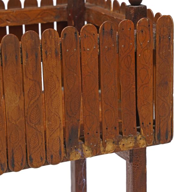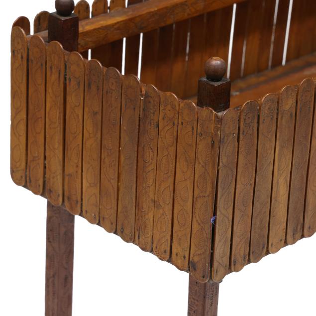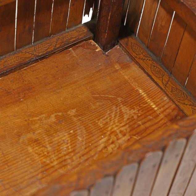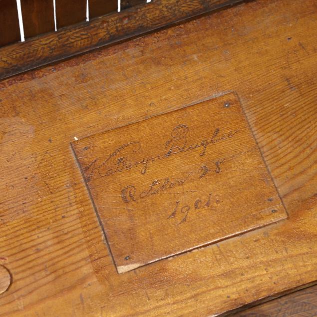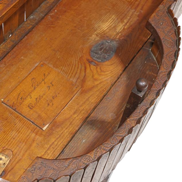 White pine with wood tongue depressors, each with intricate low relief carved flowering vine, interior boards with repeating border and central plaque reading "Katherine Bugbee, October 28, 1901," raised on five straight legs with stretcher base, all with repeating vine motifs.