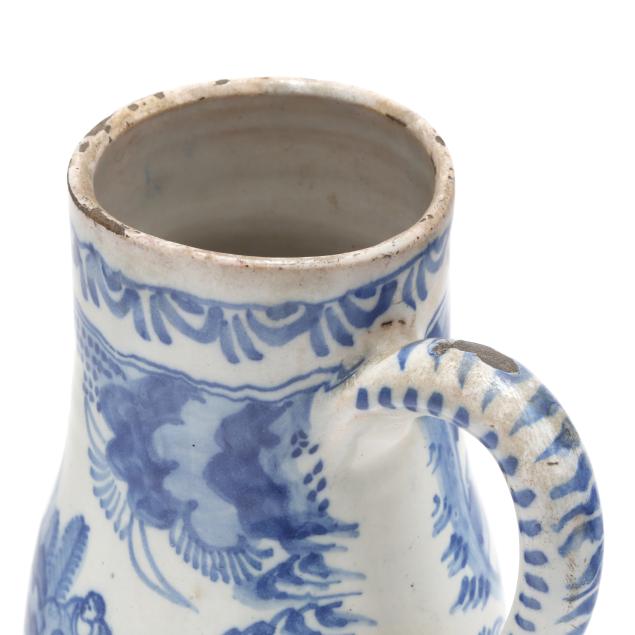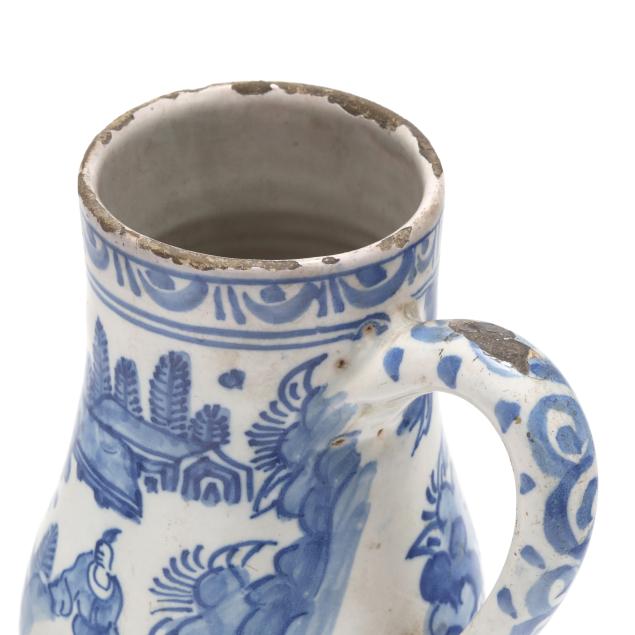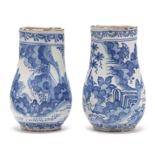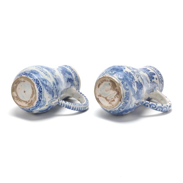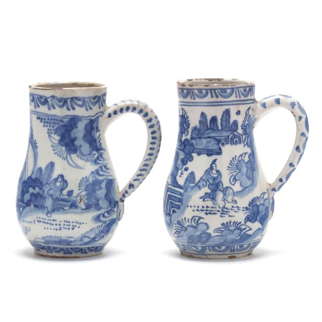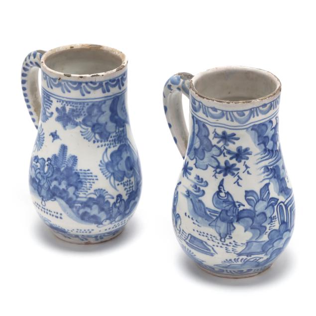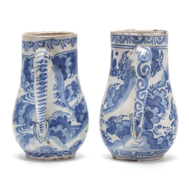 Circa 1700, tin-glazed earthenware, both unsigned, baluster form with scrolled handle, both featuring seated figures within a lush garden, the handles with brushed striped motifs.