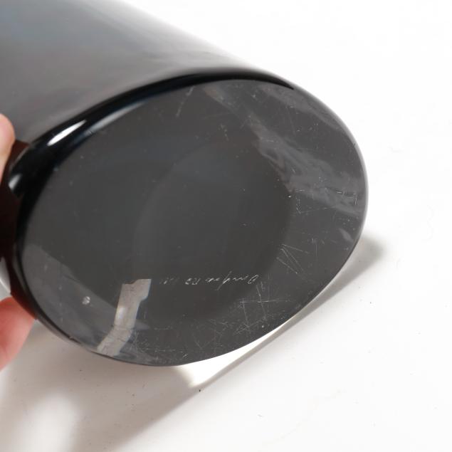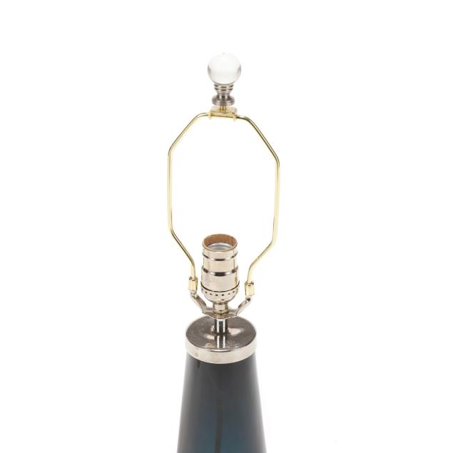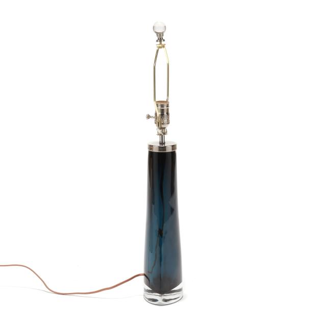 Late 20th century, cased smoky blue glass with chrome-plated mounts, signed to underside, with shade.