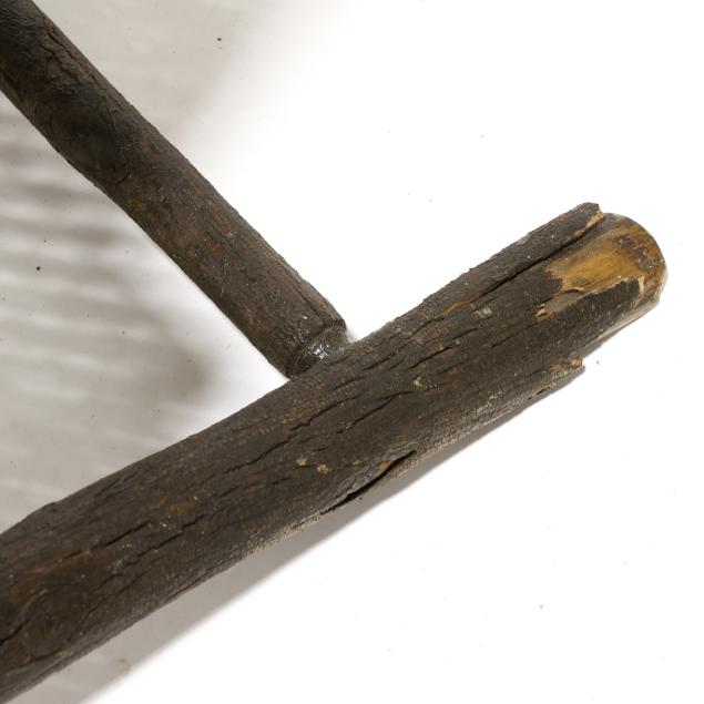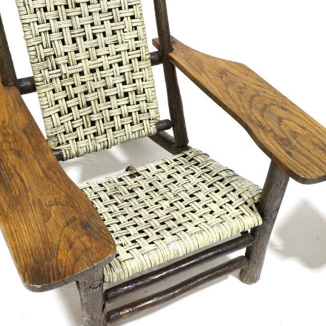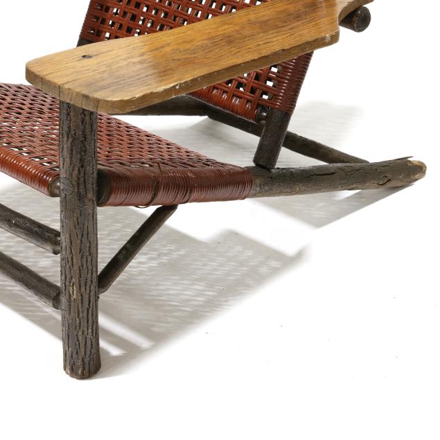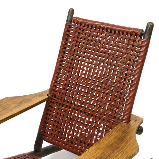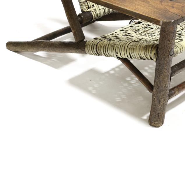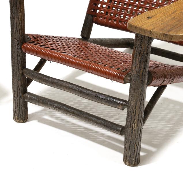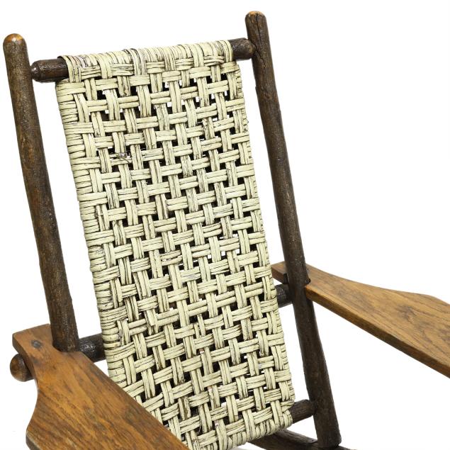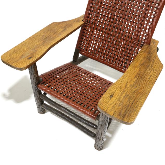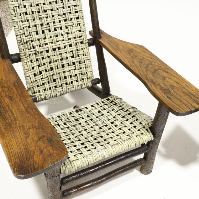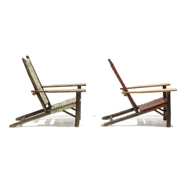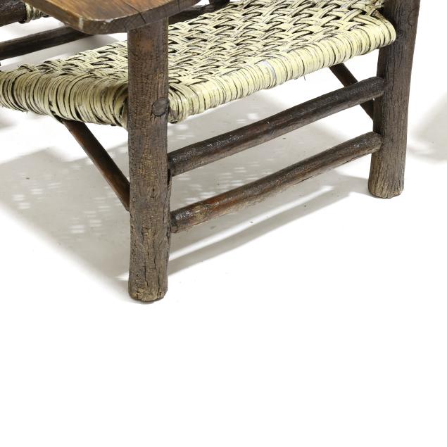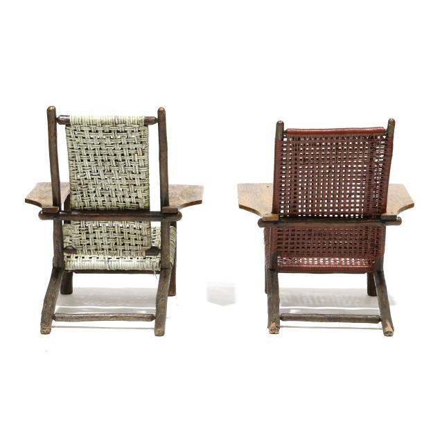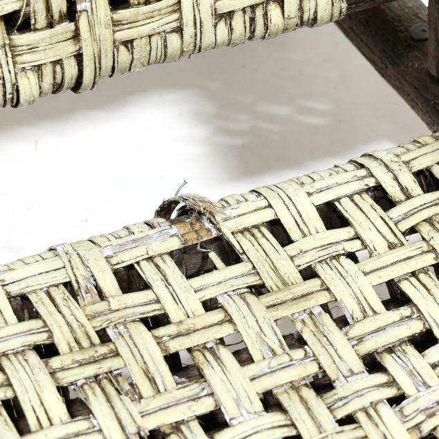 Early 20th century, hickory frames with paddle arms, red and light green painted cane, appears unmarked.