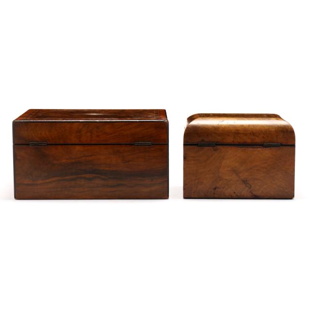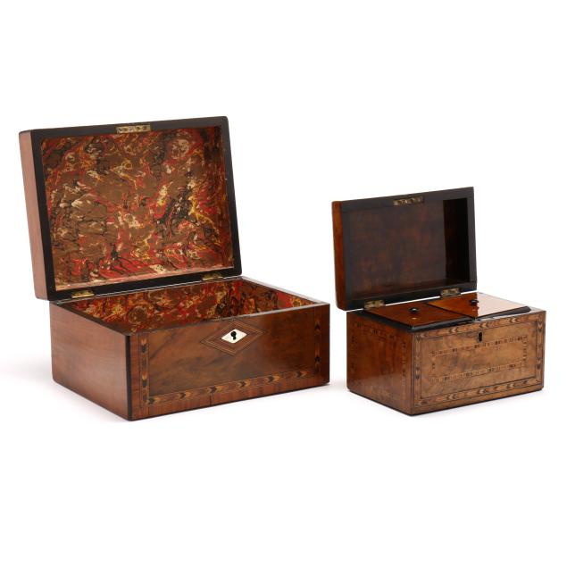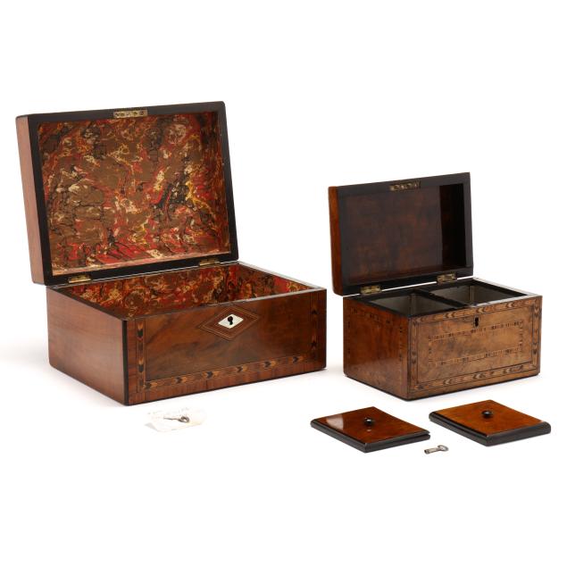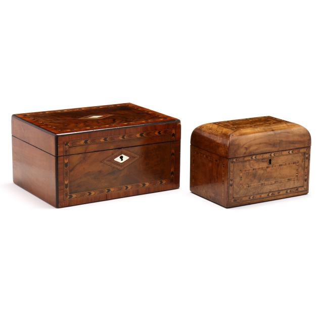 Last quarter 19th century, unmarked, rectangular forms with chevron pattern mixed wood Tunbridge inlays, the tea caddy with vaulted lid opening to twin-lidded and lined compartments (6 x 8 1/2 x 5 1/2 in.); the valuables box with walnut and mahogany veneers and mixed wood inlays, lozenge mother of pearl inlays to the lid and obverse escutcheon, open interior with marbled paper (6 x 9 x 6 in.). Includes keys.