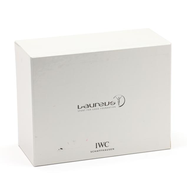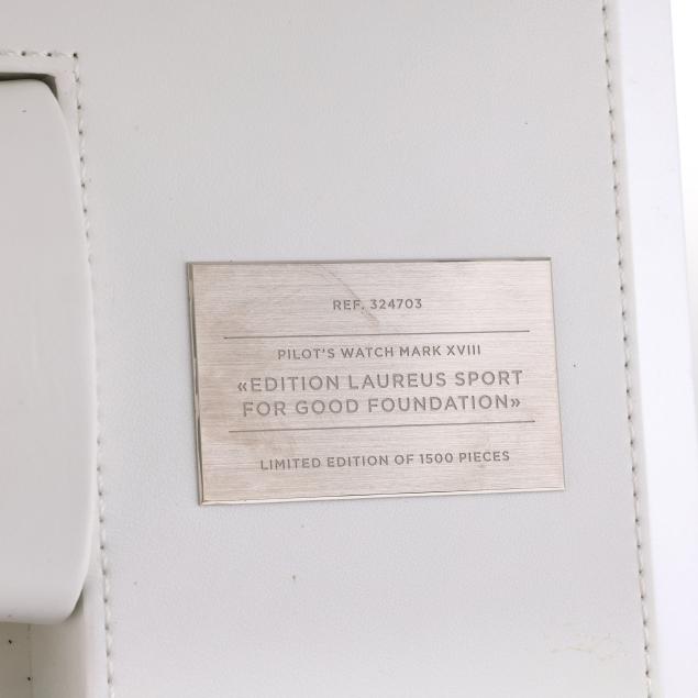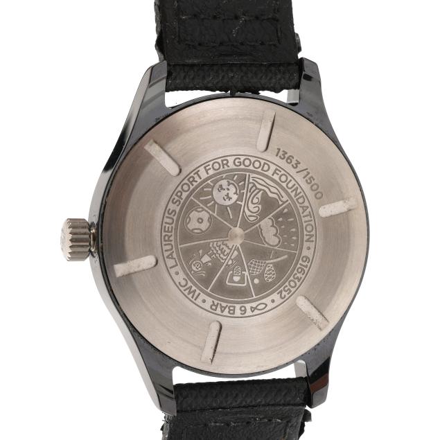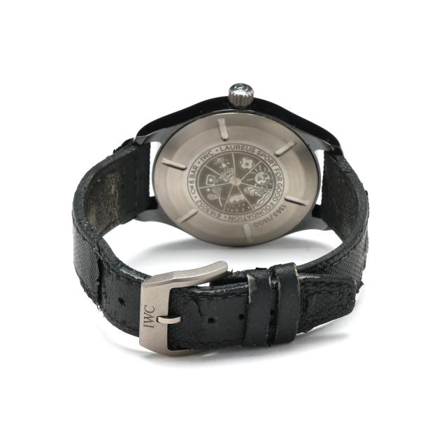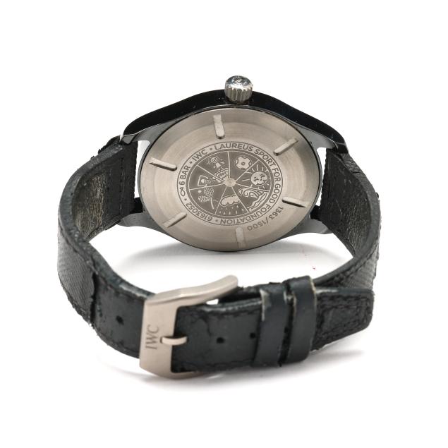 Automatic, IWC 35111, reference number 324703, serial number 6163052, limited edition number 1363/1500, the round black ceramic case with polished bezel, the signed blue dial with white Arabic numeral hour markers, luminescent lozenge hands, and date window at 3:00 hour, the signed black leather strap marked CZBN / E09676 and completed with signed titanium buckle, the signed titanium caseback with design for Laureus Sport For Good Foundation and numbered 6163052 / 1363/1500.