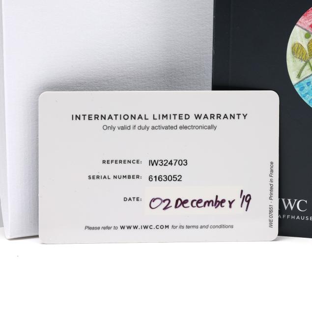 Accompanied by IWC inner and outer box, paperwork, polishing cloth, and warranty card dated 02 December '19.