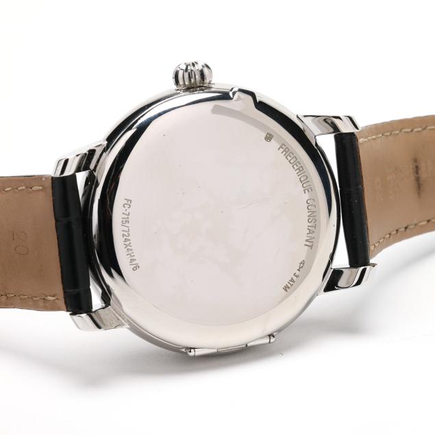 Circa 2018, automatic, FC-715, reference number FC-715/724X4H4/6, serial number 3155026, the round stainless steel case with polished bezel, the signed silver dial with silver-tone baton hour markers, silver-tone dauphine hands, and subsidiary date and moon phase dials at 6:00 hour, the signed black textured leather strap marked Alligator and completed with a signed stainless steel deployant clasp, the signed caseback numbered FC-715/724X4H4/6 and opening up to an exhibition caseback numbered 3155026.