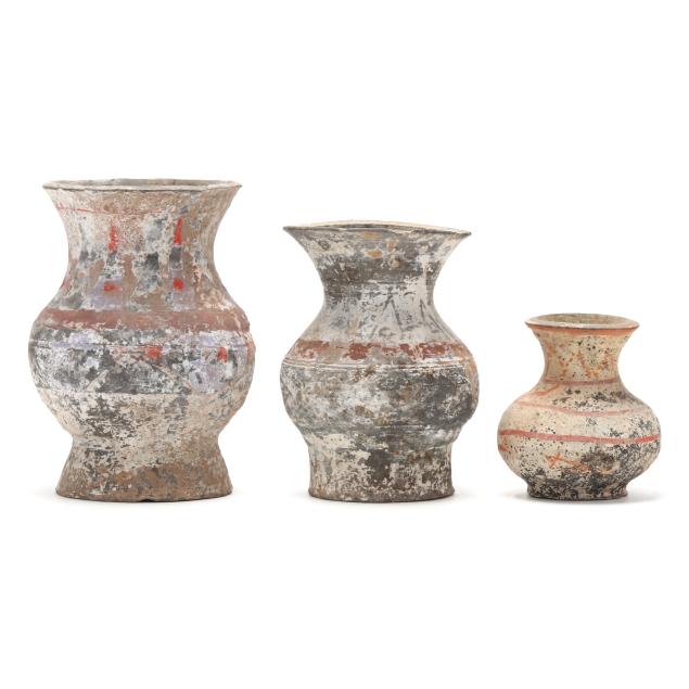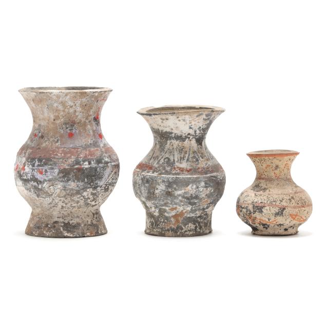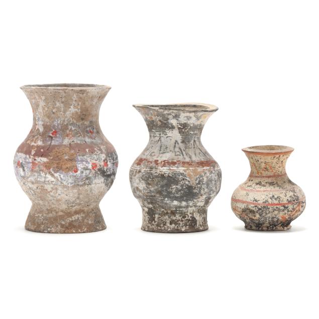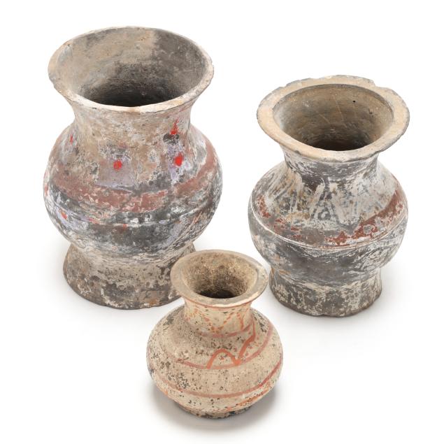 Han dynasty period or style, earthenware with pigments, of varying size, decorated in white and red with swirls and abstract patterns, jars like these were created to be included in burial tombs.
