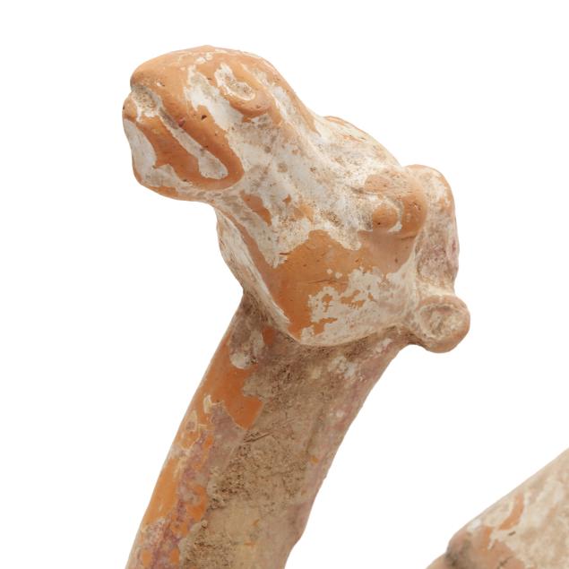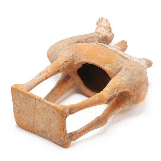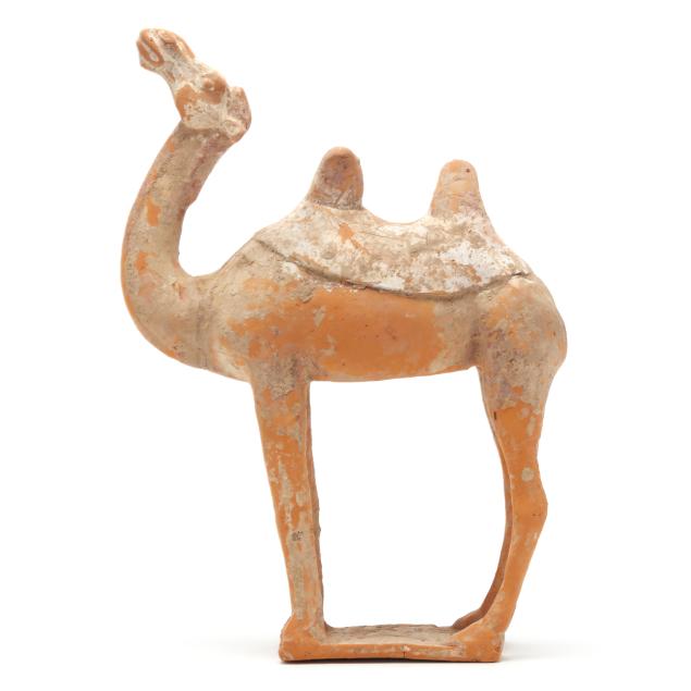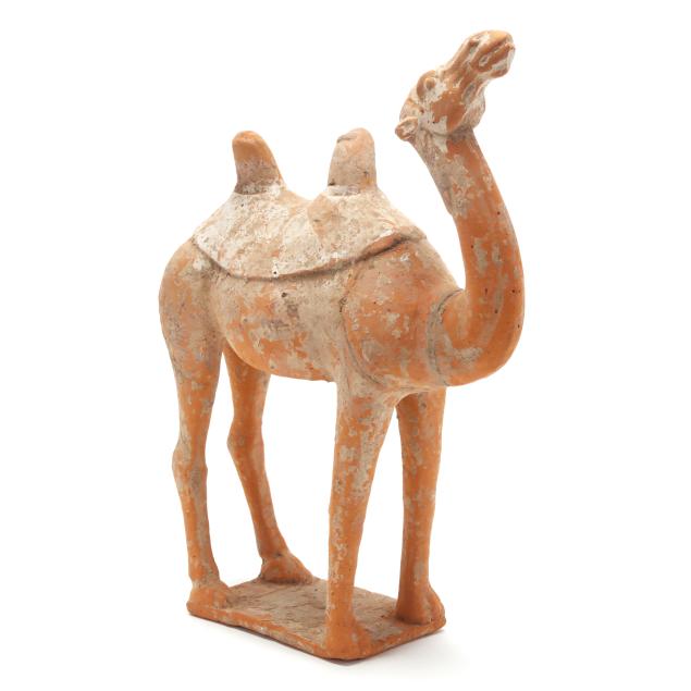 Tang dynasty period or style, earthenware with pigments, the camel with its neck and head lifted upwards, two humps to the back, raised on four slender legs over a rectangular plinth, hollow to interior.