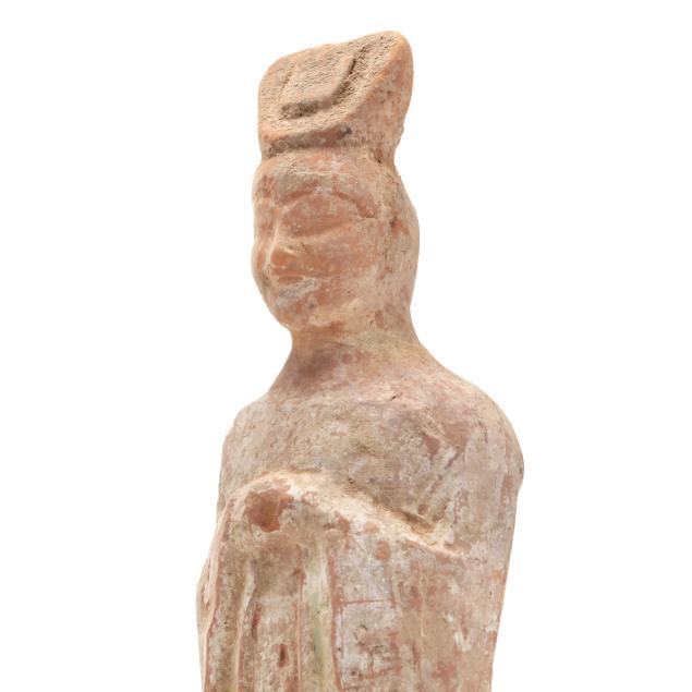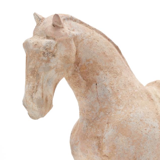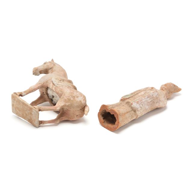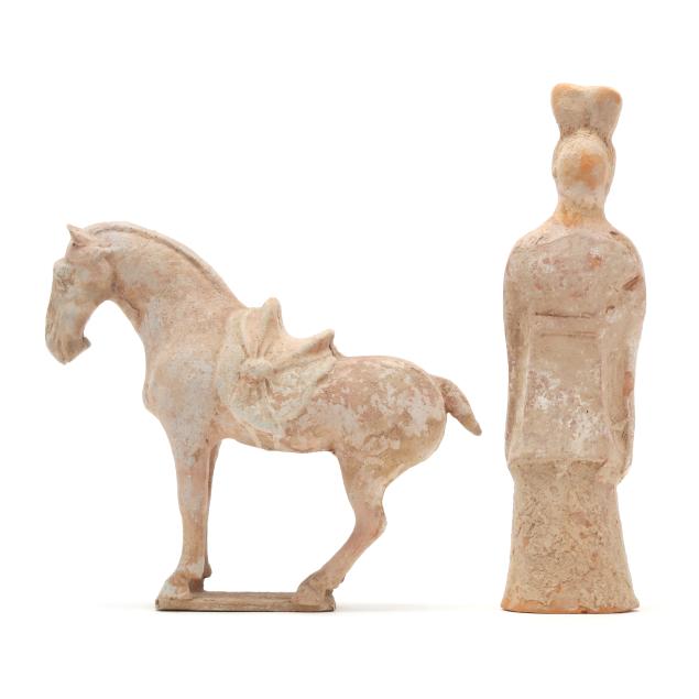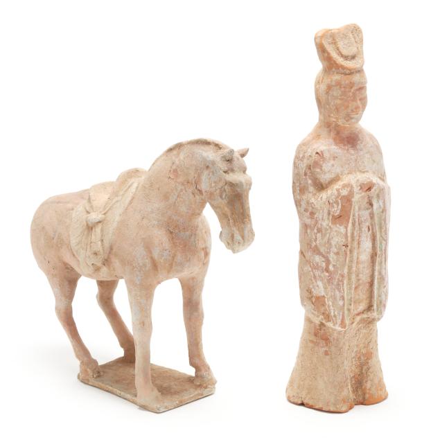 Tang dynasty period or style, earthenware with traces of white and black pigment, includes a standing official (15 1/2 in.)(nicks to base and loss to pigment), and a horse (11 1/2 in.)(visible firing cracks and loss of pigment), both are hollow to the interior.