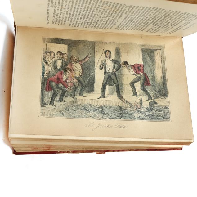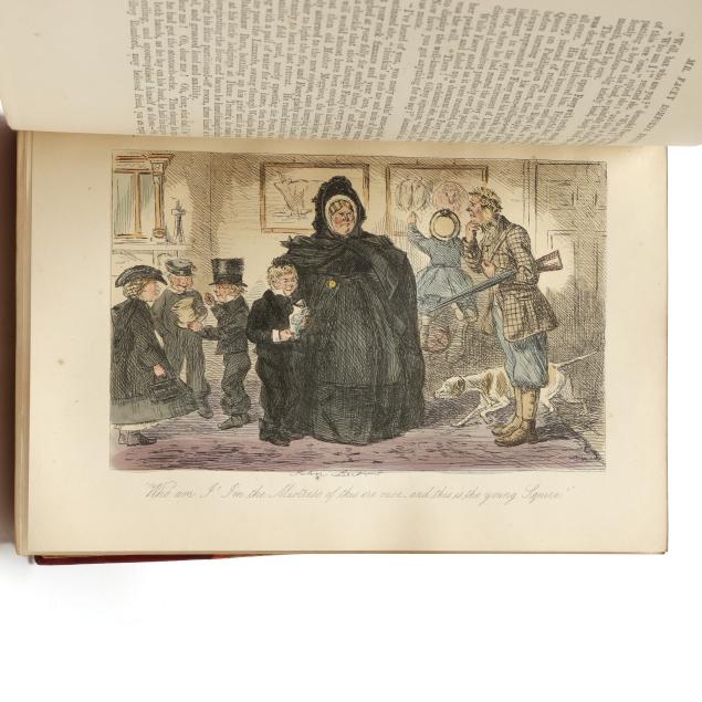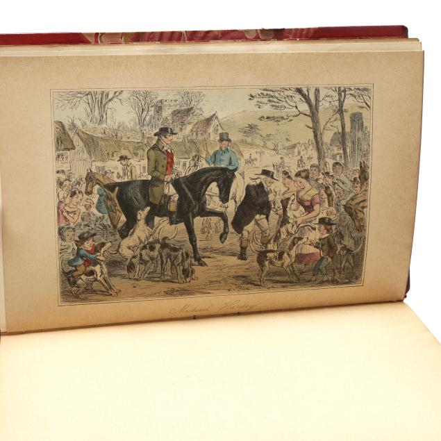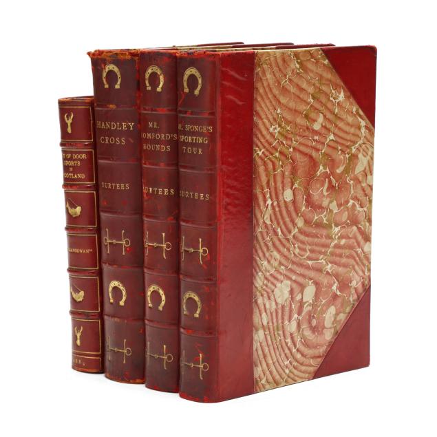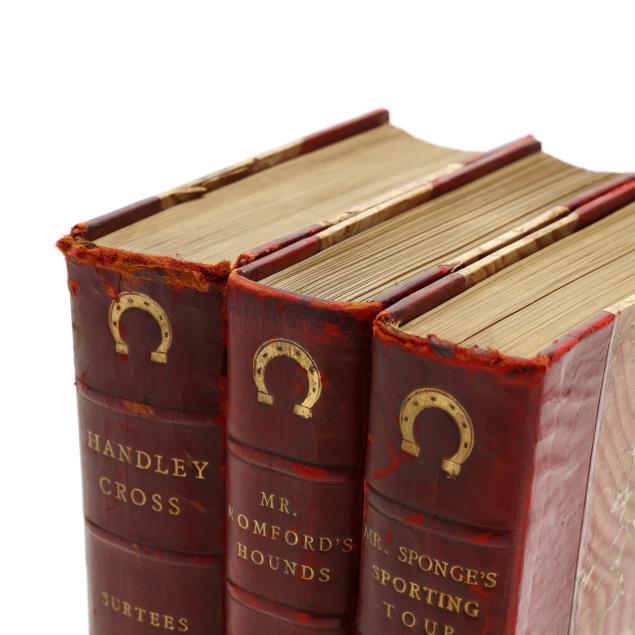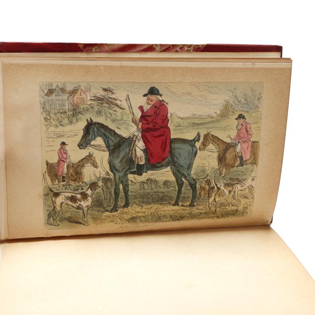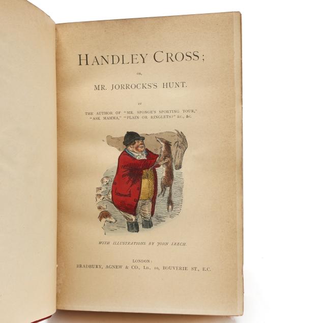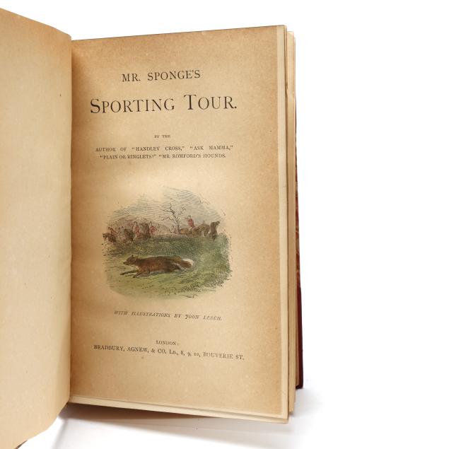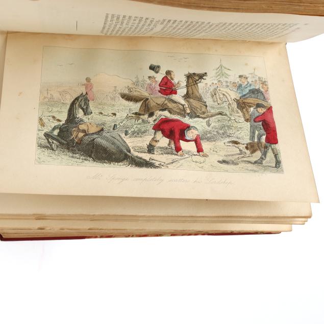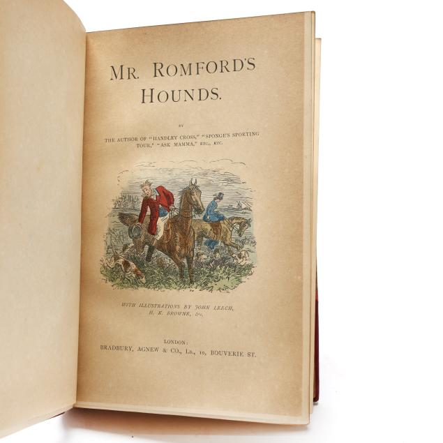 Mr. Romford's Hounds with illustrations by Leech others) including in-text and hand-colored plates. (General age and handling wear to boards; some rubbing to edges, corners, joints, and spines with occasional fairly heavy wear to ends; interior with occasional hinge cracking, toning, grime/soiling, minor wear to page edges, and light scattered foxing; one with cracking to frontispiece; one with ownership inscription; occasional additional light wear from handling but overall clean and sturdy volumes.)