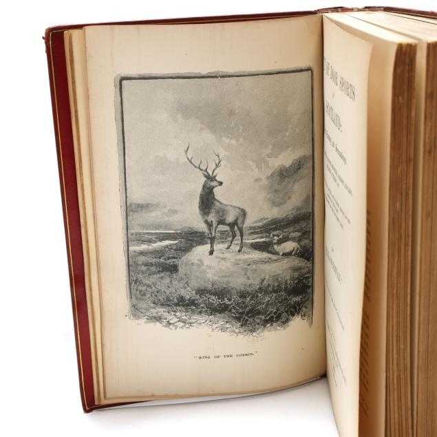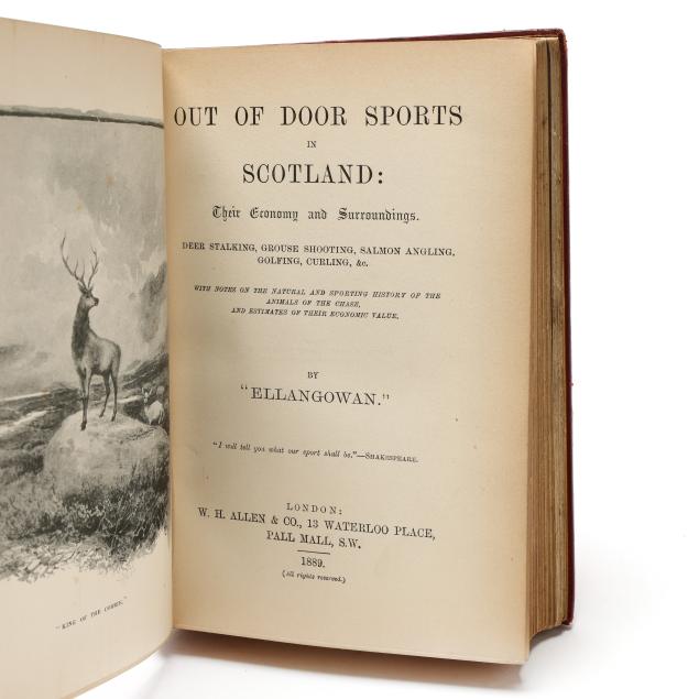 Out of Door Sports in Scotland: Their Economy and Surroundings. Deer Stalking, Grouse Shooting, Salmon Angling, Golfing, Curling, &c. With Notes on the Natural and Sporting History of the Animals of the Chase, and Estimates of their Economic Value. London: W. H. Allen & Co., 1889. Full red morocco, spines with raised bands and gilt lettering and sporting decorations within compartments, with gilt top edge and marbled endpapers; gilt-stamped "BOUND BY ZAEHNSDORF" on front turn-in. 8vo; 388pp.; with rear fold-out. Book rebound with 1920s typed material and Thomas & Sons hunting outfitters catalogue inserted at the end; binder's receipt pasted to rear free endpaper. (Light age wear to boards, rubbing to extremities, and mild chipping to head of spine; interior with light toning, small corner damp stain to frontispiece leaf, occasional spot of foxing, an area of minor gutter wear, and light grime/staining to page edges. A clean and very good copy.)