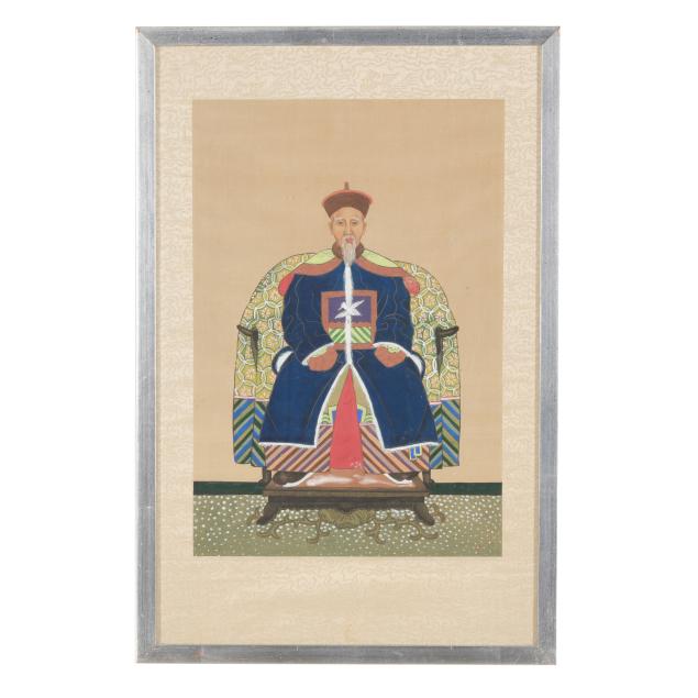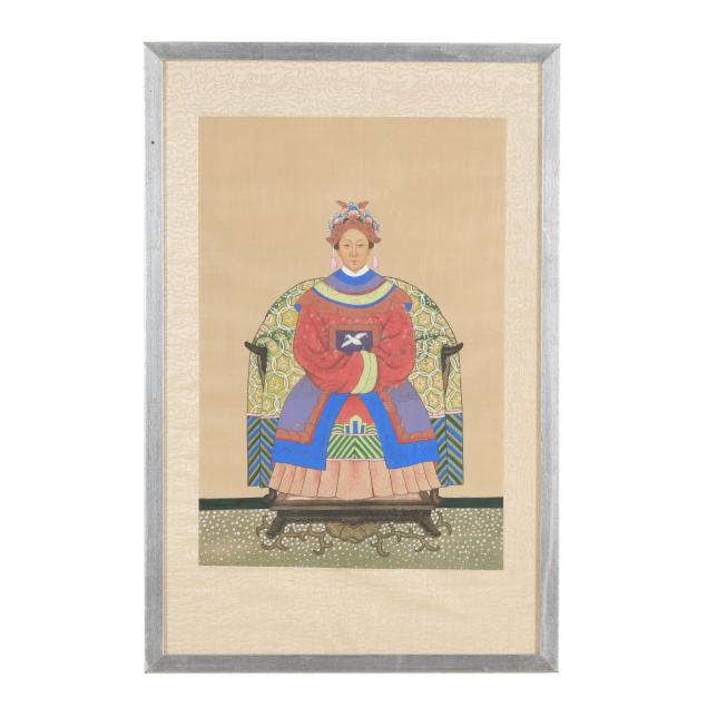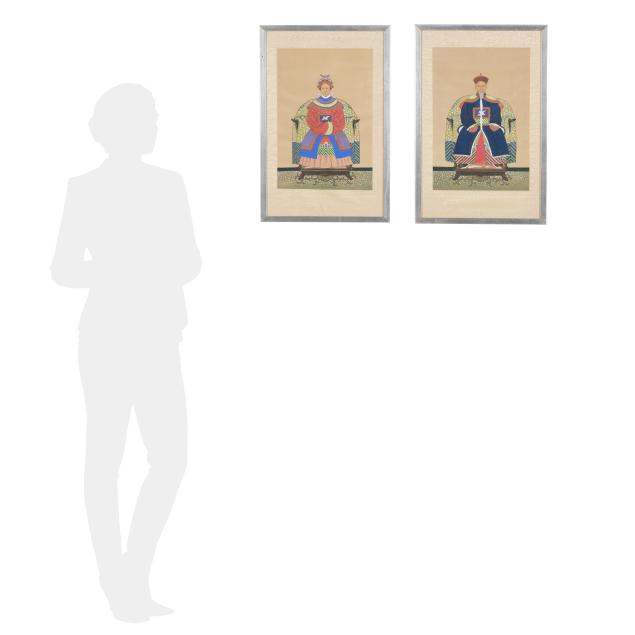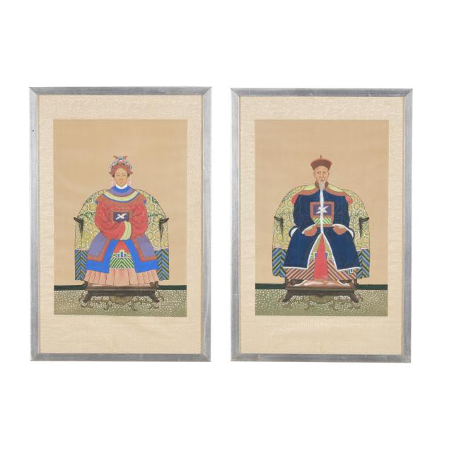 20th century, ink and colors on silk, a male ancestor is depicted wearing formal court robe with civil rank badge, seated on a throne chair with floral covering, the woman is also dressed in a formal court robe, elaborate headdress and earrings, seated on a chair with same textile draped on back of chair as her partner, a finely rendered rug below both chairs, presented framed under glass.