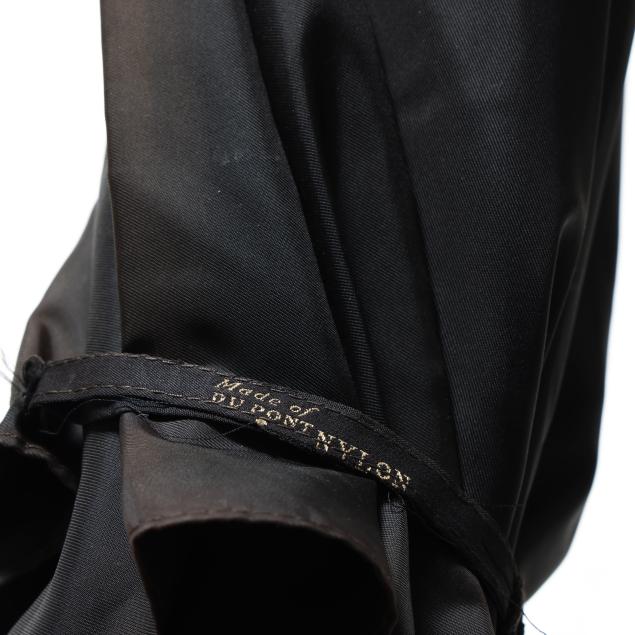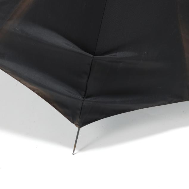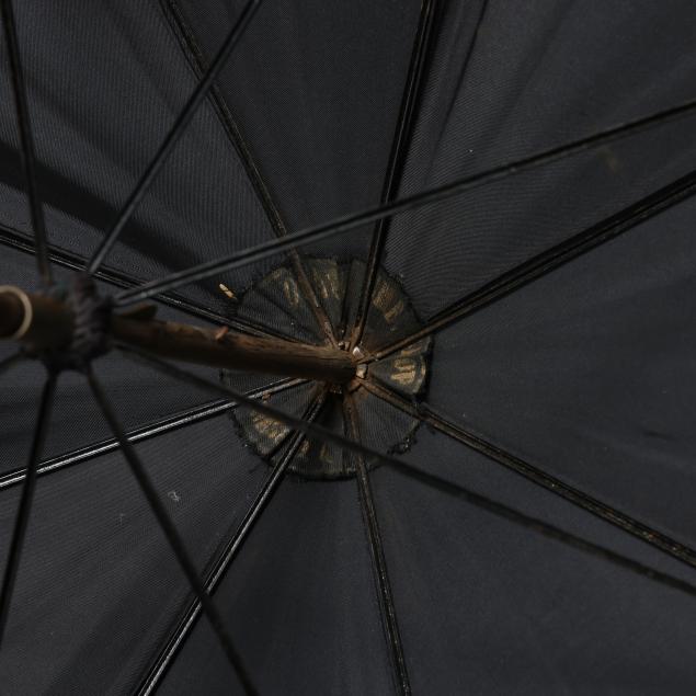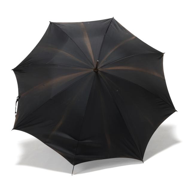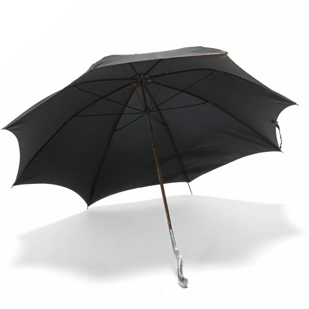 Late 19th - early 20th century, all with silver-toned mounts; the first with dark wood opera type handle, over a mahogany shaft, unmarked(36 in.); the second with exotic dark wood carved crook handle, shaft and handle, the shaft and handle featuring silver mounts, unmarked (37 in.); the third item, an umbrella stamped "The Gorham Co." to the sinuous Japanese style handle, the top engraved