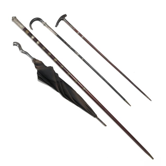 Mrs. R. H. Whetstone (34 in.); the fourth, a wooden staff with brass and silver-toned handle and ferrule mounts, likely Southeast Asian, unmarked (55.25 in.).