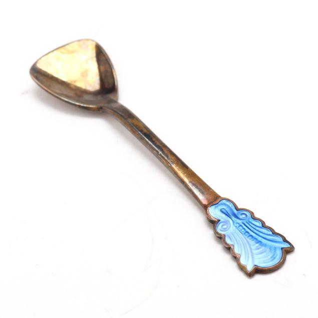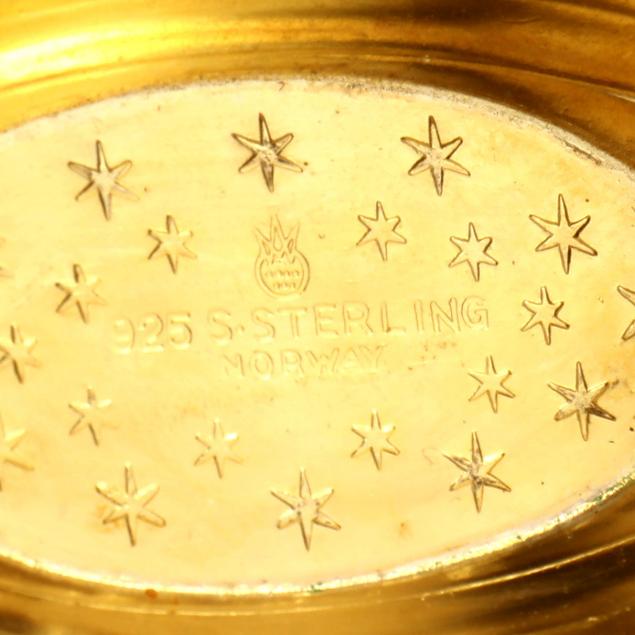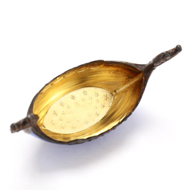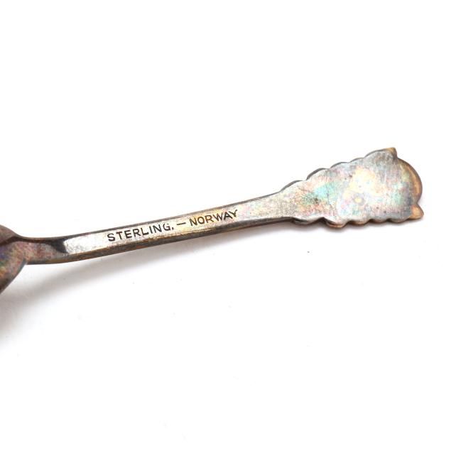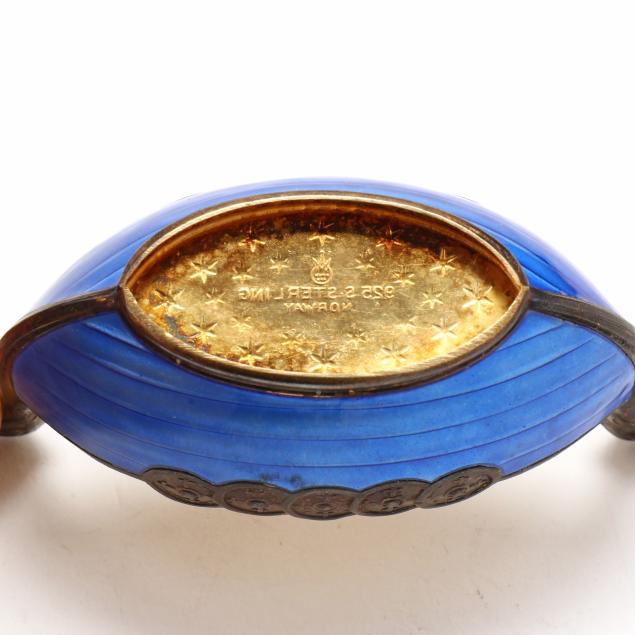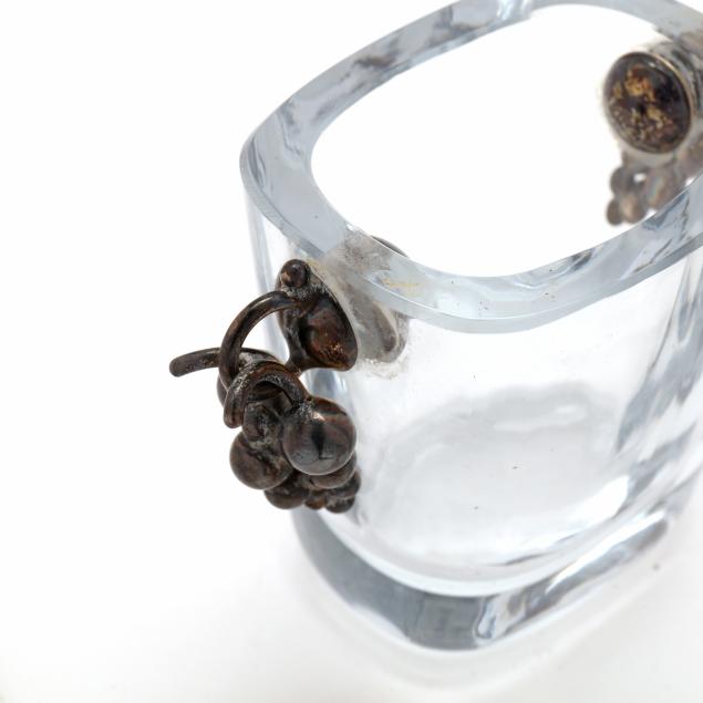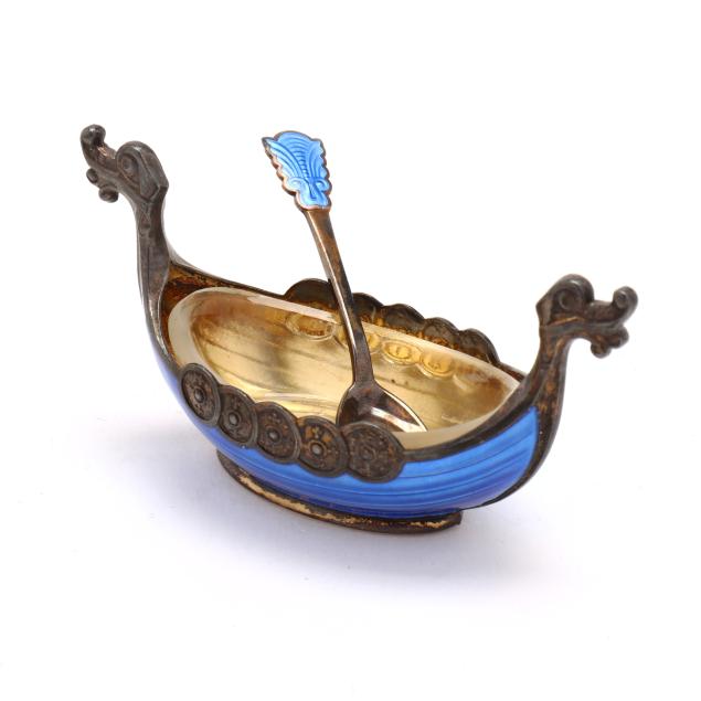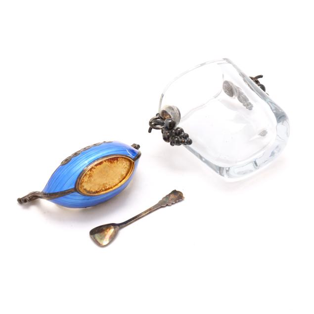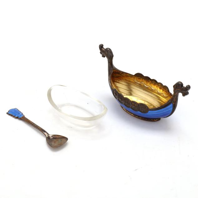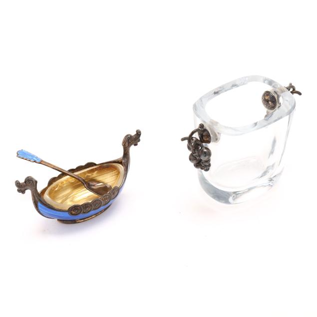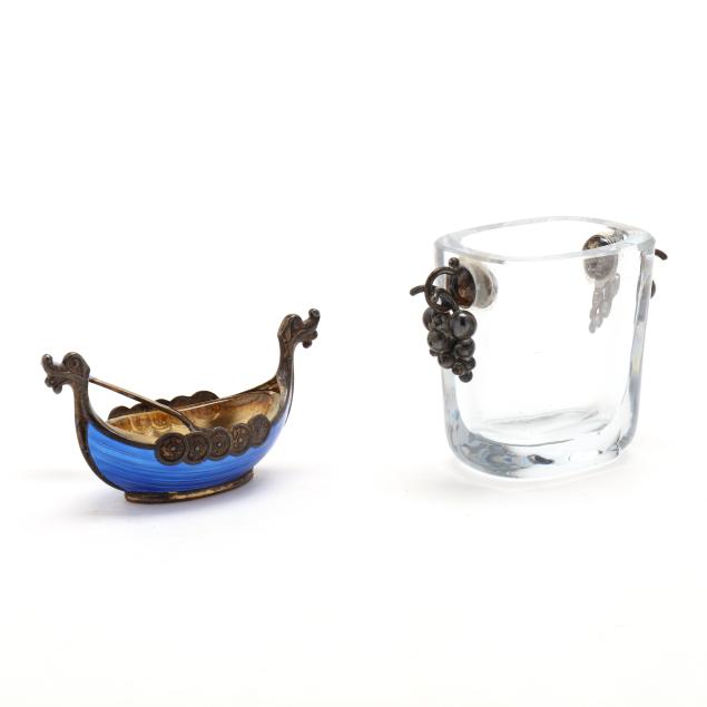 Mid- to late 20th century, the first a Norwegian silver and enamel salt cellar and spoon, in the form of a Viking ship, mark of Theodore Olsen Eftf and "925S," with gilt interior and glass insert, together with a conforming salt spoon (3 1/2 in.); the second a Strombergshyttan Danish glass vase with silver grape cluster handles, unmarked (2 1/2 in.).