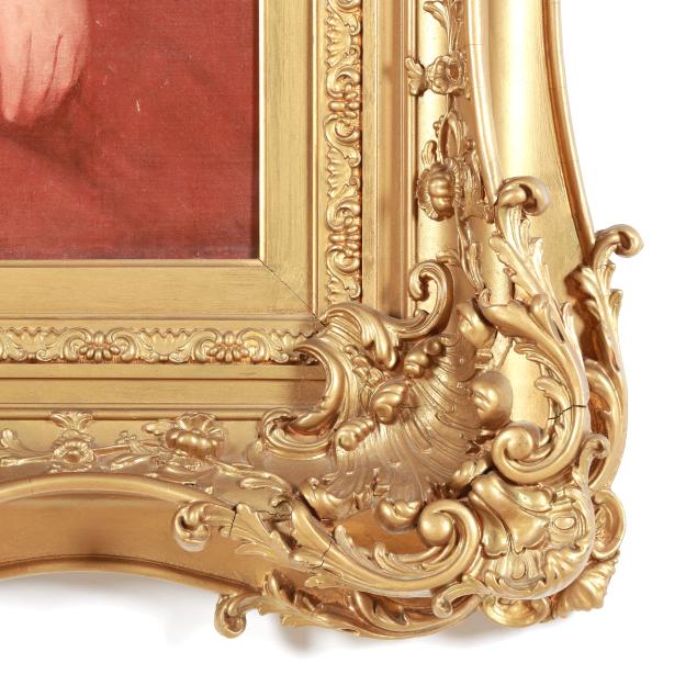 Oil on canvas (laid on board), not signed, labeled with sitter and artist attribution to verso, presented in an ornate period giltwood frame.