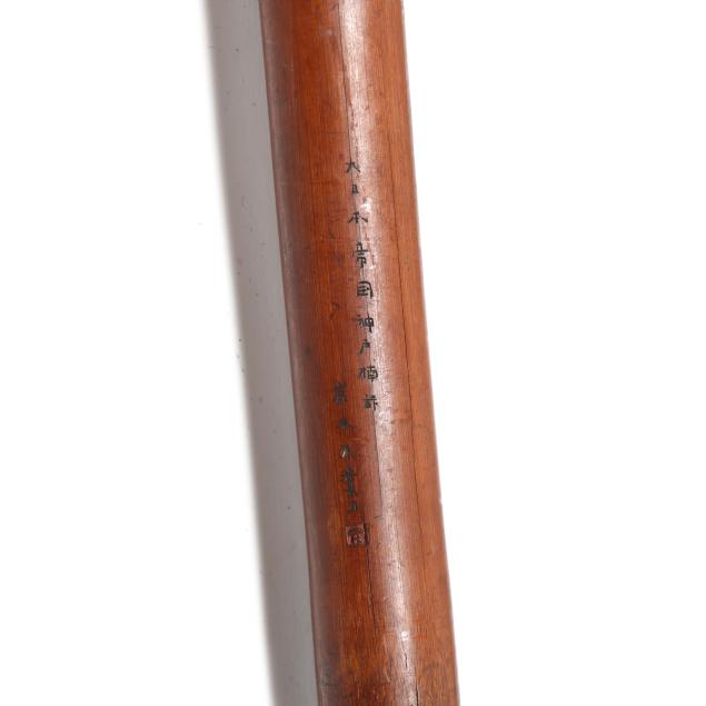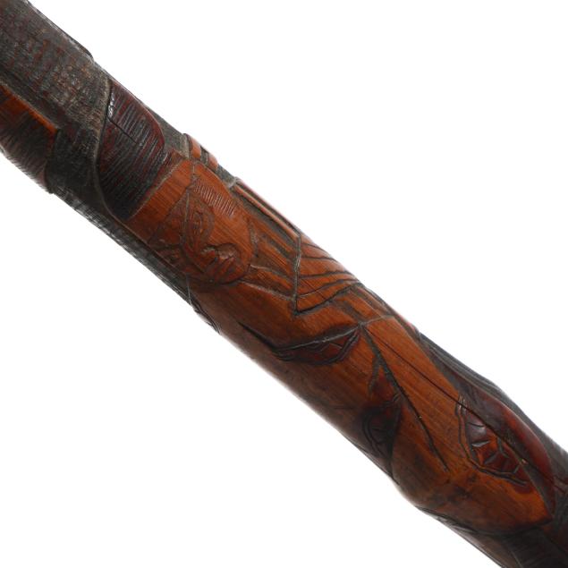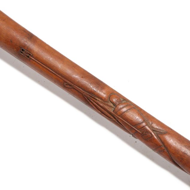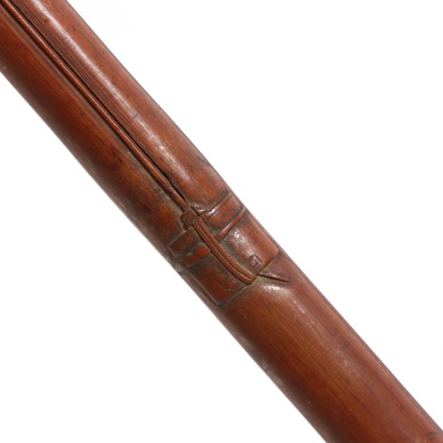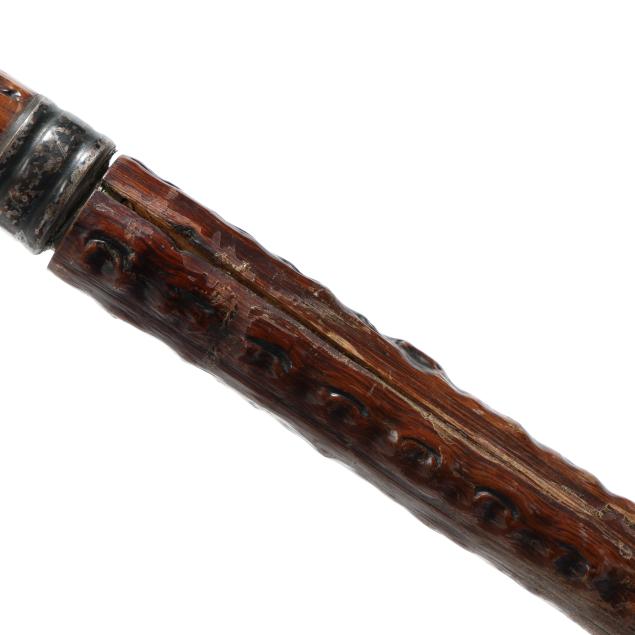 From the Estate of the late Susan C. Frankenberg, Hillsborough, North Carolina Handling wear and age cracks to wooden elements (appear stable); some denting and scratches to silver, cane with possble loss to mount on handle tip.