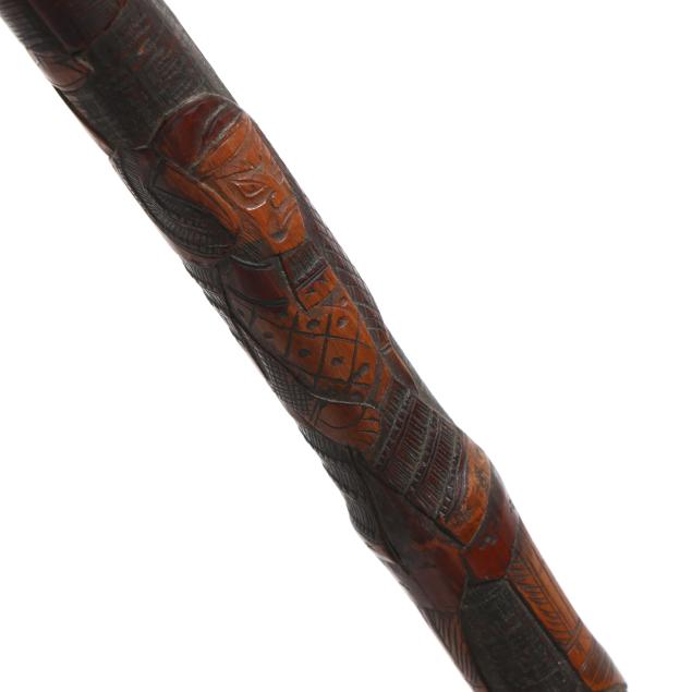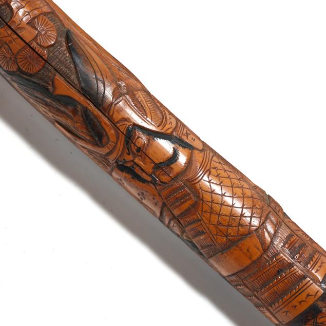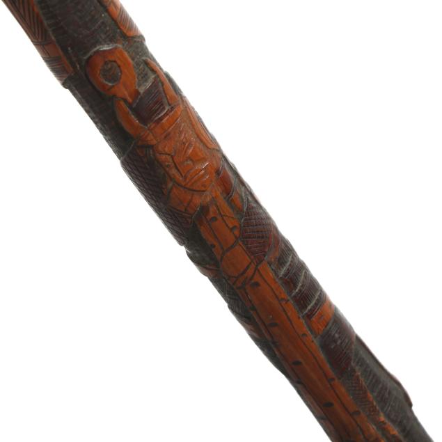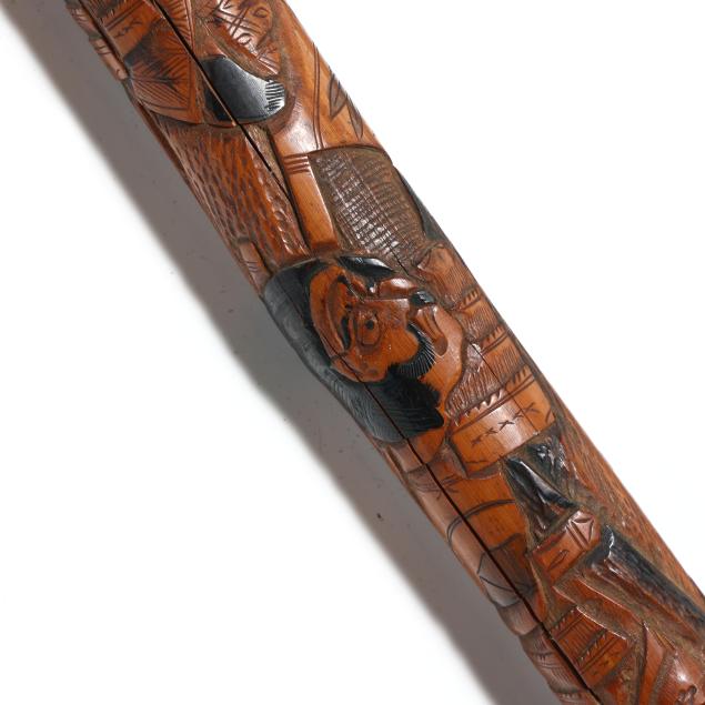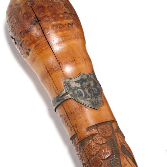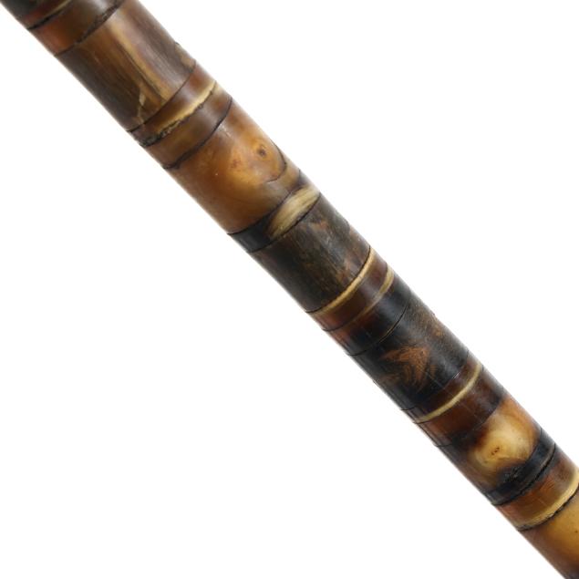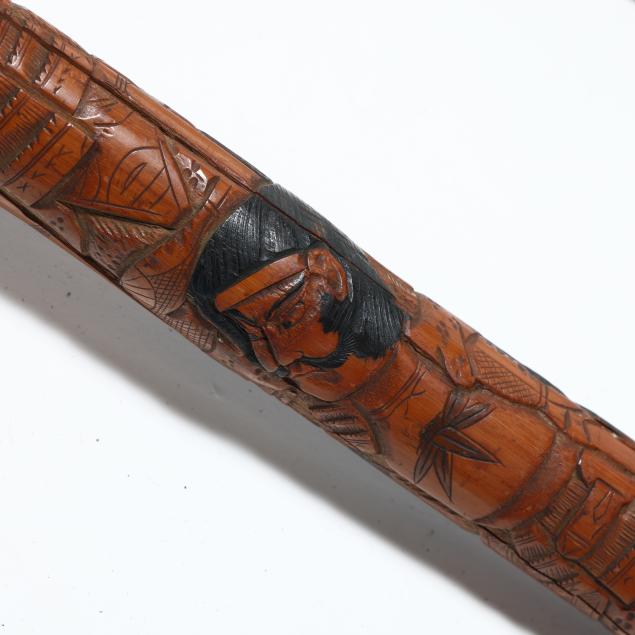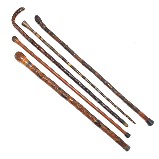 19th-20th century, the first walking stick carved in bamboo, depicting samurai and flora motifs, likely Japanese (36.25 in.); the second with similar carvings in bamboo, with silver-toned shield ferrule engraved "JB" and silver-toned ground tip (33 in.); the third a likely lacquered briarwood, featuring a silver stoned ferrule mount beneath the crook type handle (36.5 in.); the fourth a walking stick wooden shaft is carved with a western-style 19th-century cannon barrel (34.5 in.); the fifth walking stick consists of stacked carved horn rings with bulbous handle, unmarked (34.5 in.).