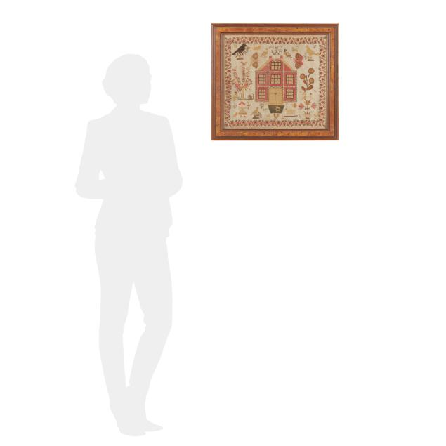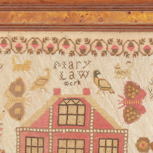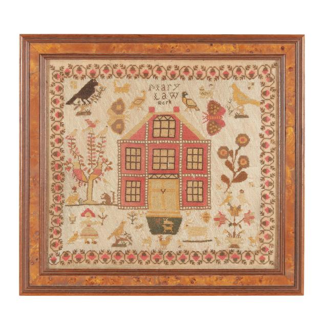 Silk on linen, with wool, 19th century, worked primarily in cross stitch, with large central house surrounded by spot motifs including floral sprays, butterflies, birds, and a girl holding a flower, signed "Mary / Law / work" to upper center, with trailing berry and leaf border and ground filled in with white wool tent stitches, framed.