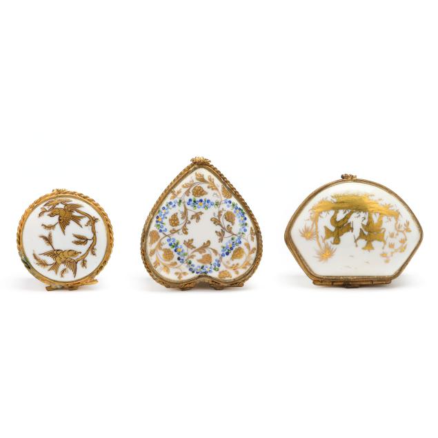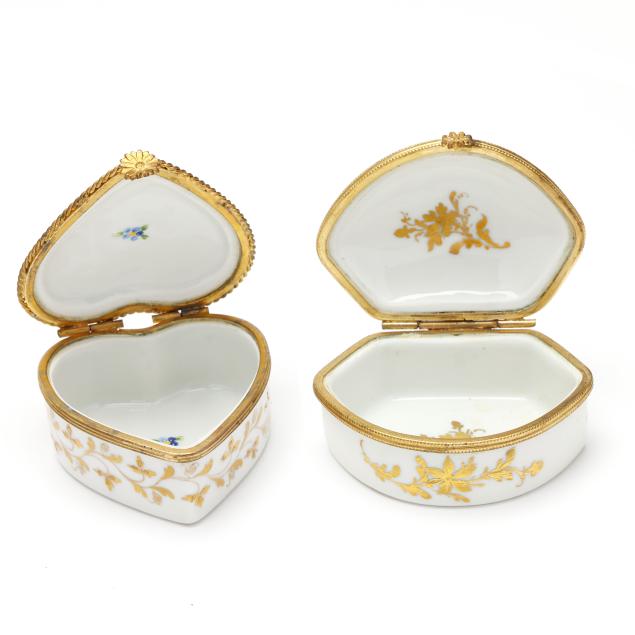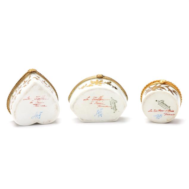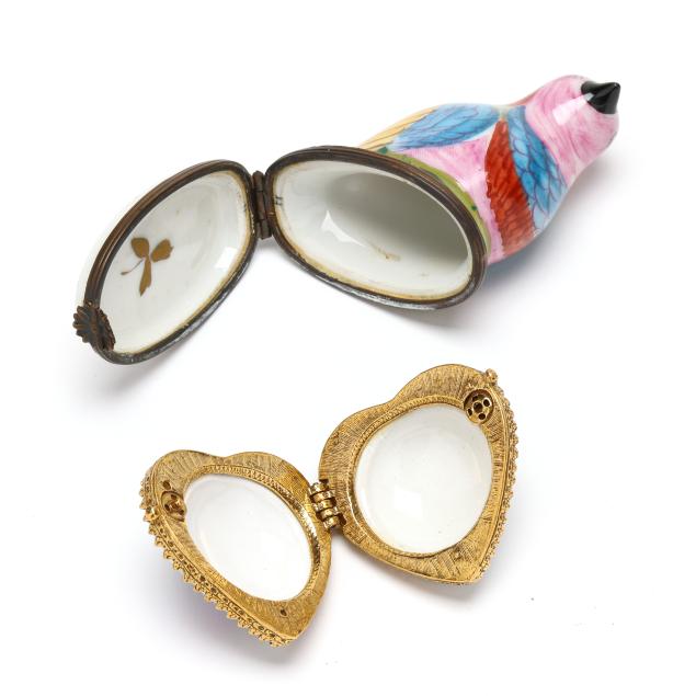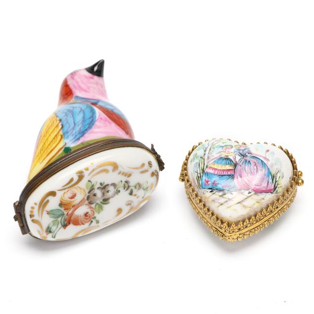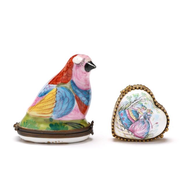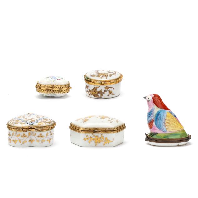 19th-20th century, (3) marked Le Tallec/Limoges to underside with artist's signature, each with gilt decoration, including heart, trapezoidal, round box forms; an unmarked hand-painted porcelain bonbonniere molded in the shape of a parrot; the fifth a later heart shaped box with hand-painted scene of two women to one side and a transfer floral spray to the other.