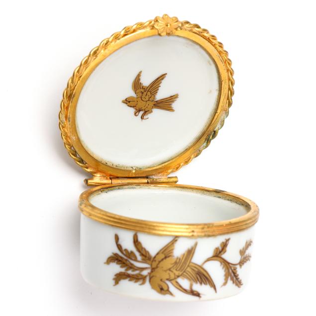 From the Collection of Josephine Chapman Borthwick, Pinehurst, North Carolina A few small areas of verdigris to brass trim of circular box; minute paint fleck to parrot beak.