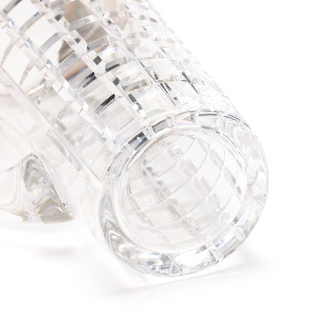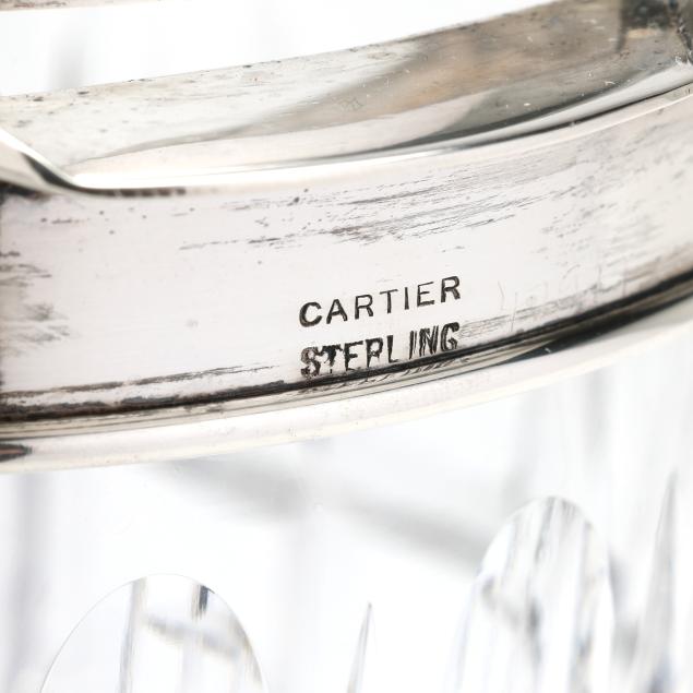 Late 20th century, faceted cut grid pattern to the crystal, scrolled handle, and silver-mounted rim marked "Cartier / Sterling."