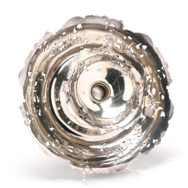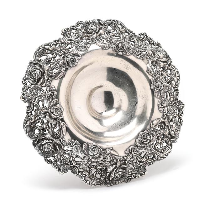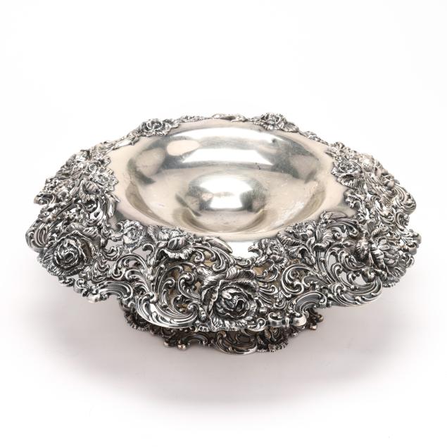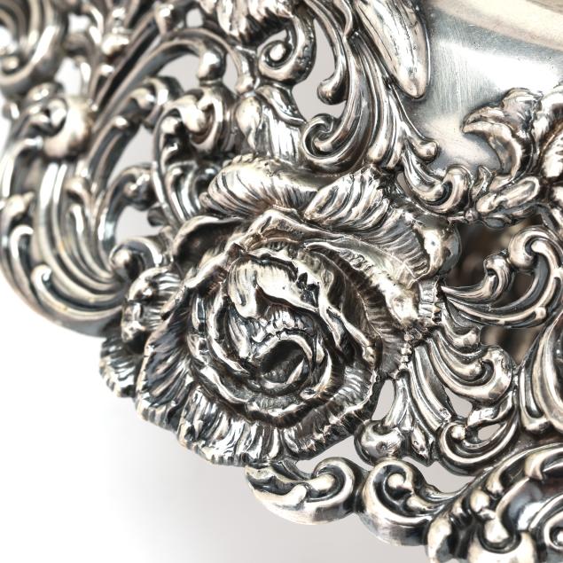 New York, turn of the century, pattern number 616, featuring reticulated rose and scrolling decoration in high relief to the rim and foot, not monogrammed.