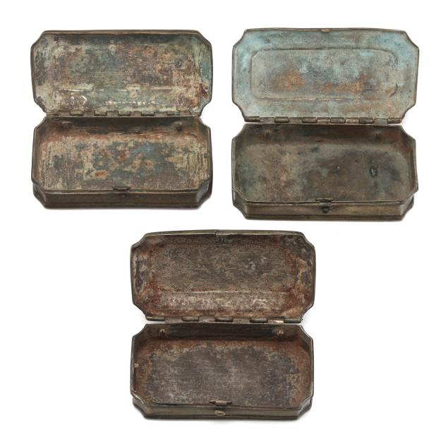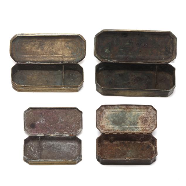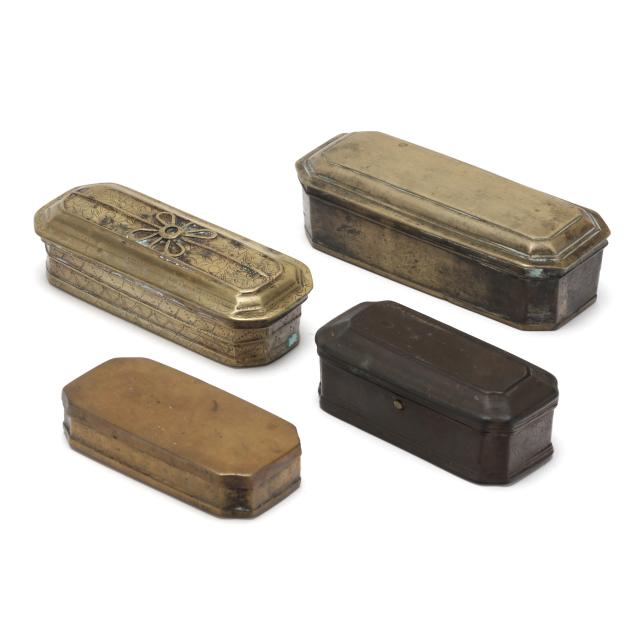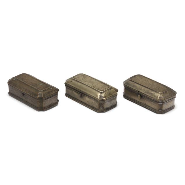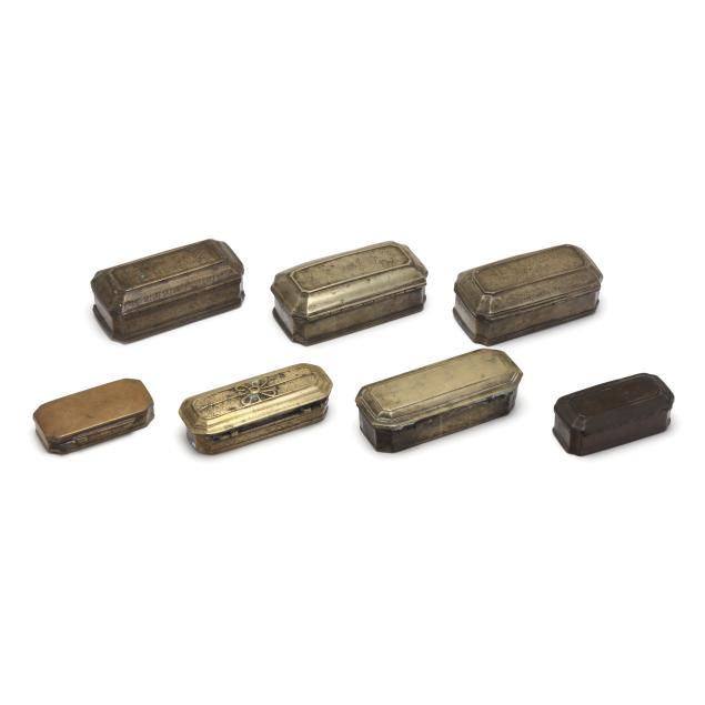Likely Dutch, (7) 18th- and 19th-century brass boxes in rectangular form with canted corners and hinged lids, (5) with engraved floral decoration, (4) with divided interior.