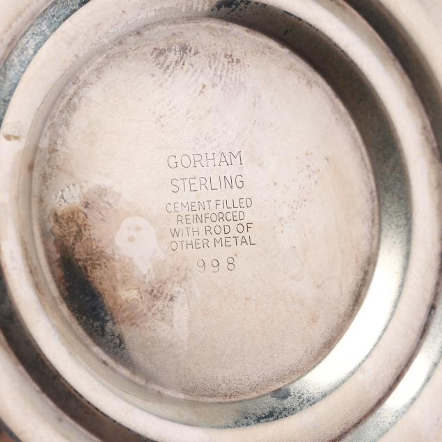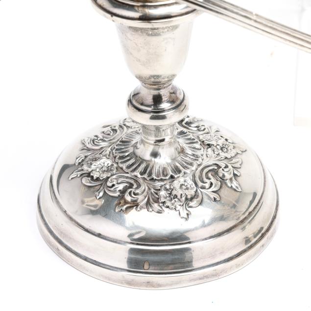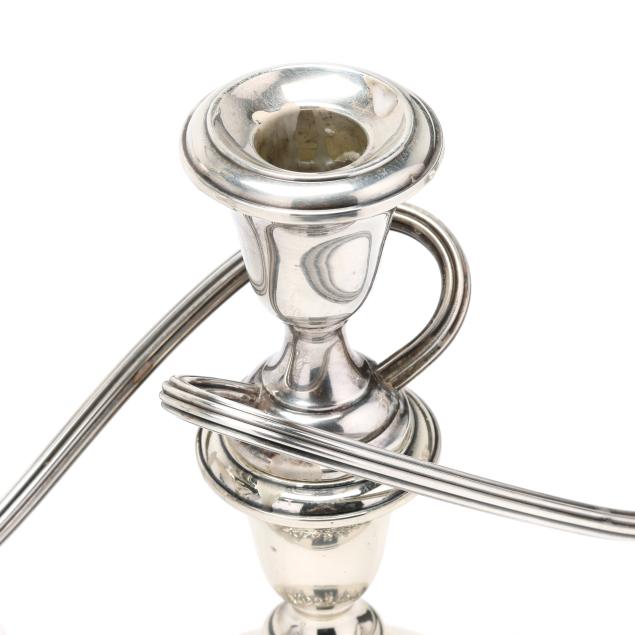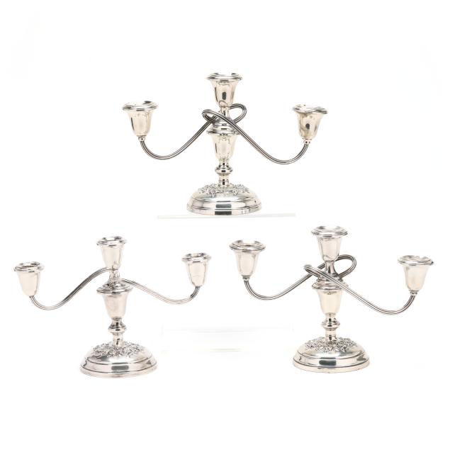 Pattern number 998, each a convertible two-part, three light form; with reeded candle arms and repoussé decoration to the domed feet, not monogrammed, weighted.