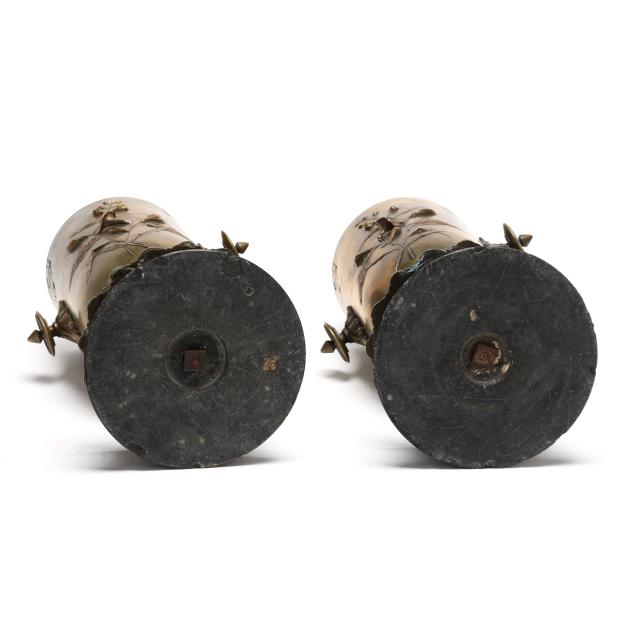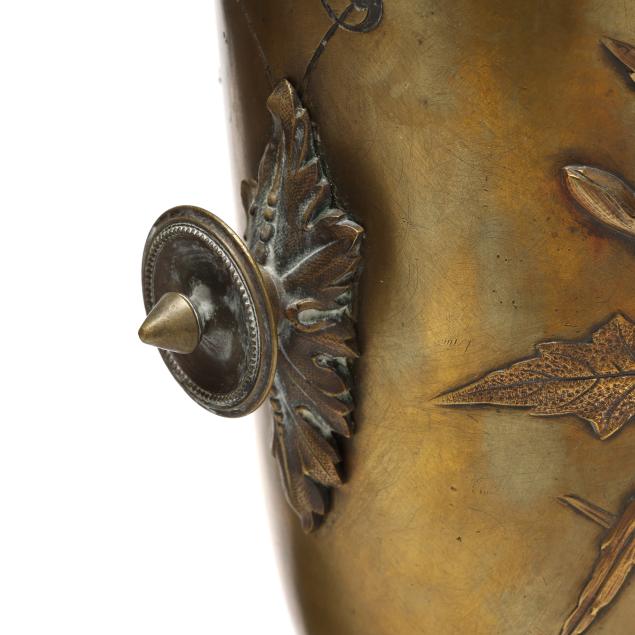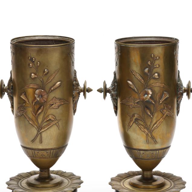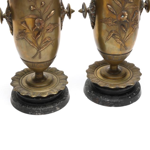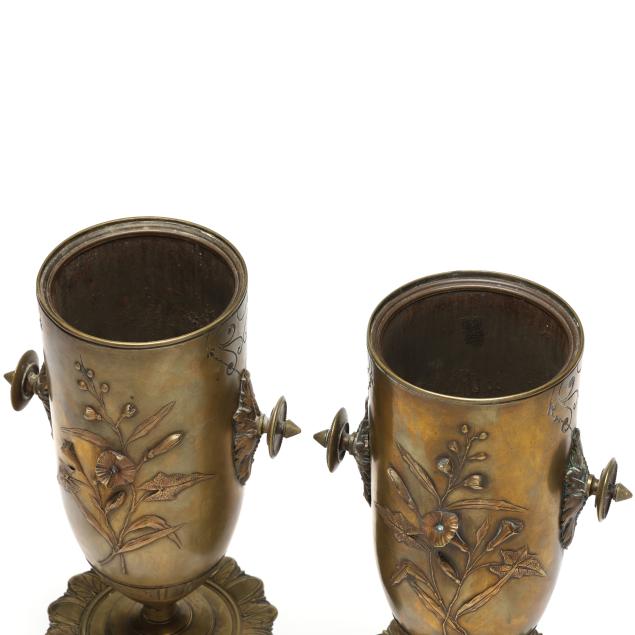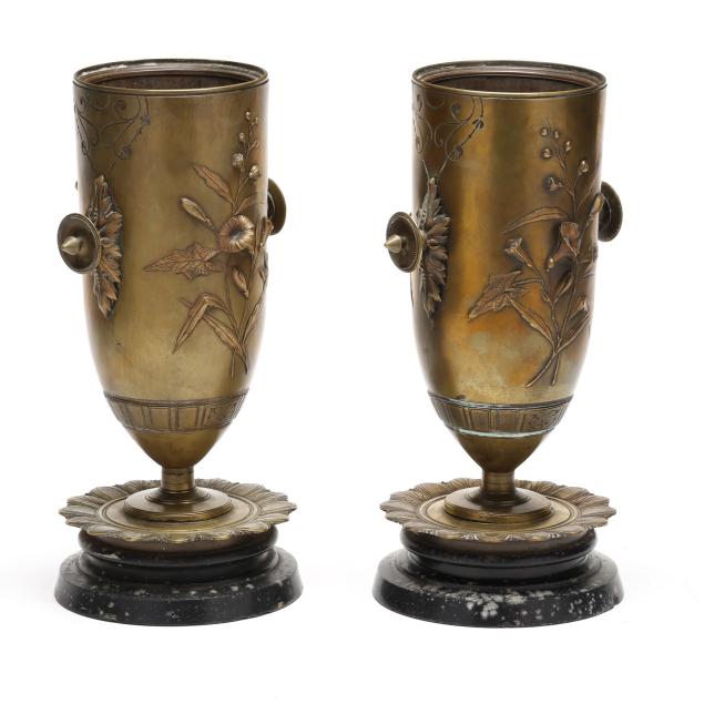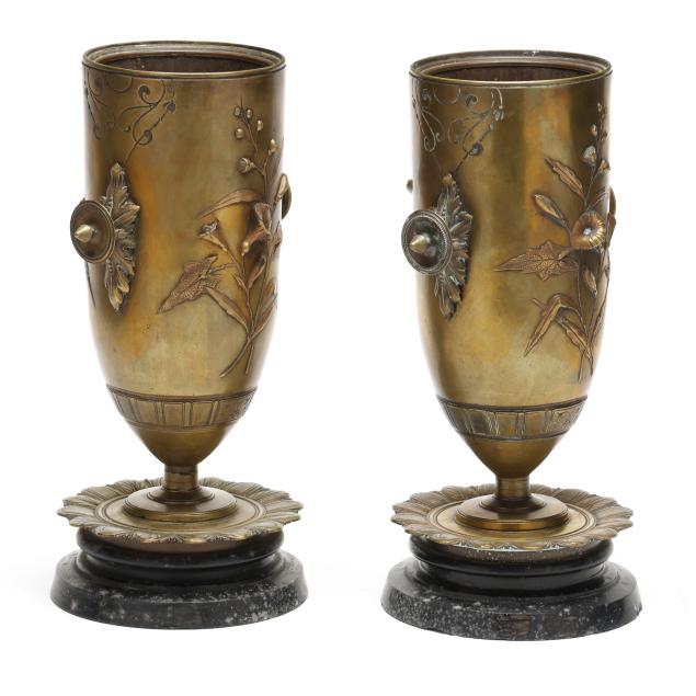 Last quarter 19th century, bronze cylindrical forms featuring a well chased floral relief and tracery motifs, between foliate and spire double handles, interior with metal liner, the pedestal foot with palmette terrace rim, mounted atop a slate socle, unmarked.
