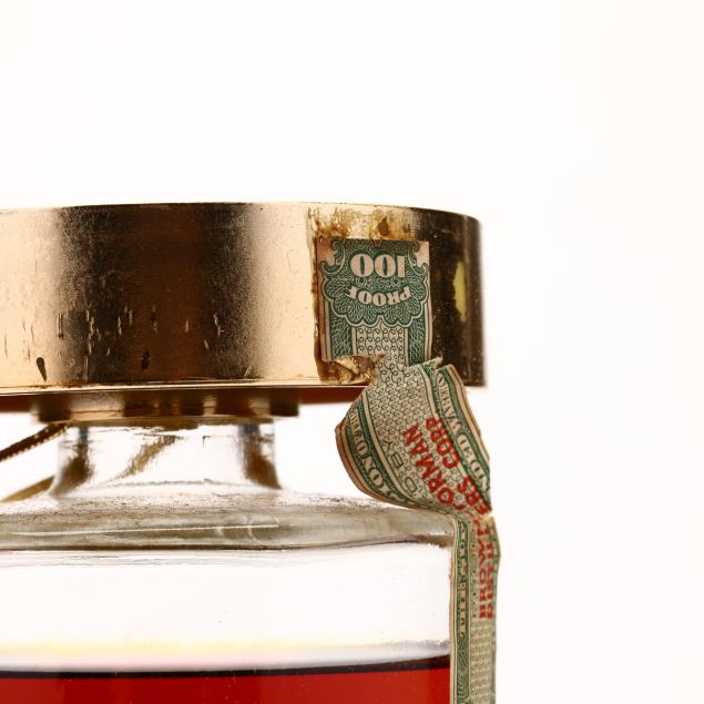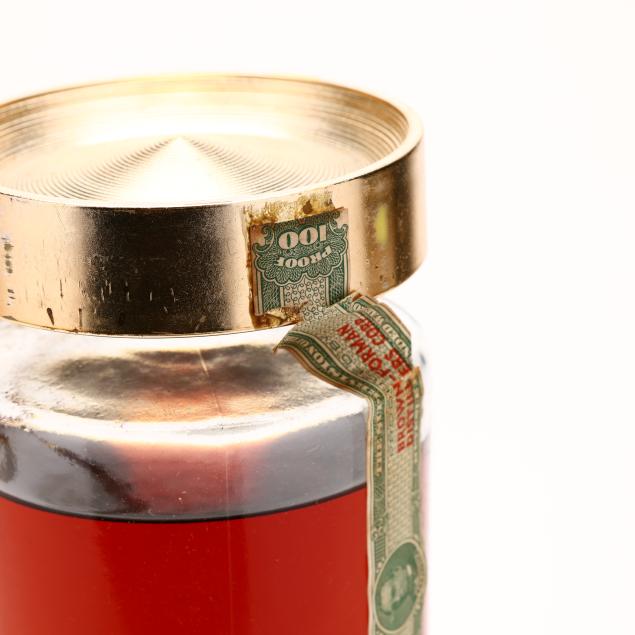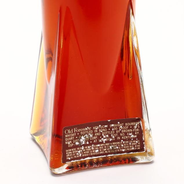 NV, Old Forester Kentucky Straight Bourbon Whisky, Bottled in Bond, Brown-Forman Distillers Corporation, Louisville, KY, 50%, made spring 1955, bottled fall 1960, nearly full bottle, bottle no. A 796332, tax strip slightly torn but intact, sealed decanter, ocb (1 4/5 Quart)