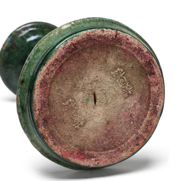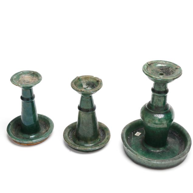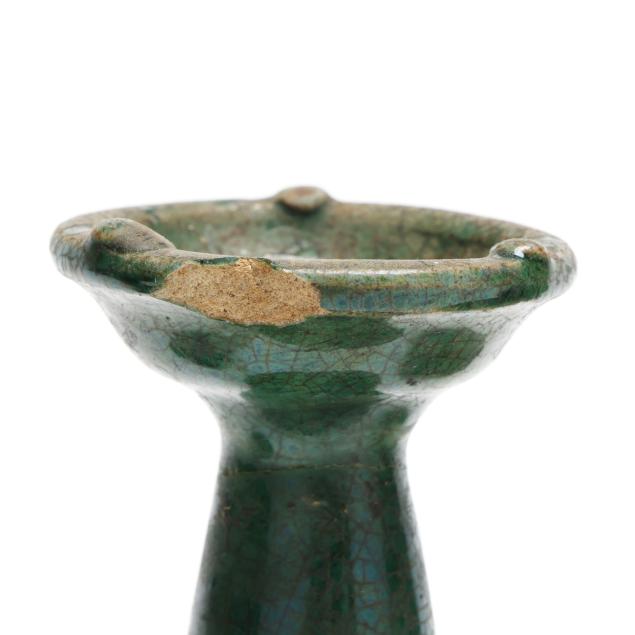 Circa 1900, Shiwan pottery oil lamps, hollow cylinder column tapering to a cup with three spurs, thick crackled glaze pooling at the circular base, one stamped to underside.