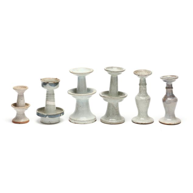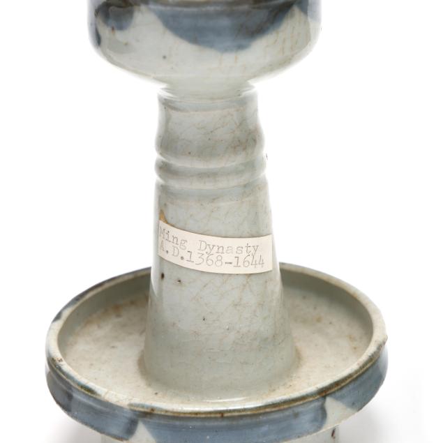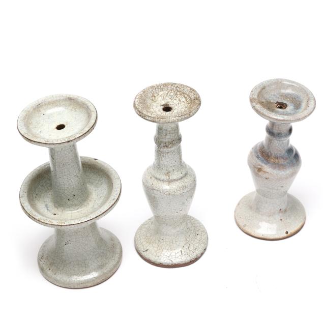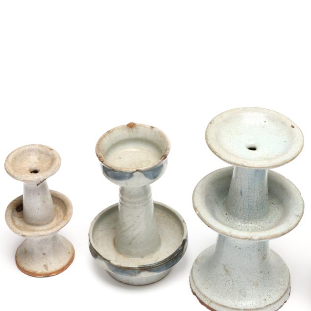Circa 1900, Ming dynasty style, oil lamps with hollow cylinder column tapering to a cup, drip holder below, thick crackled glaze to each.