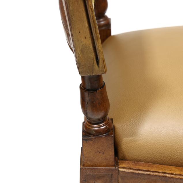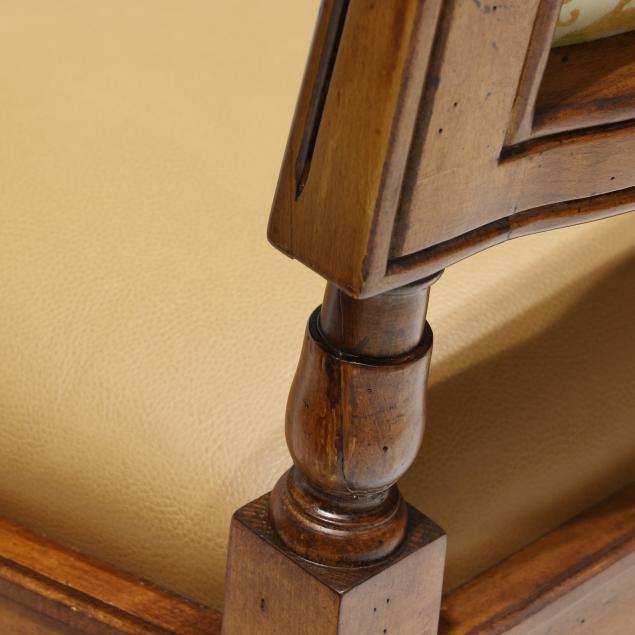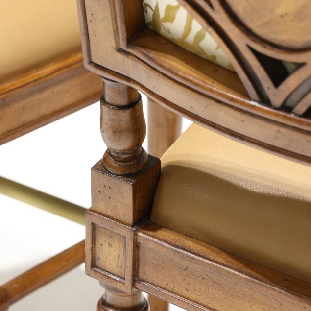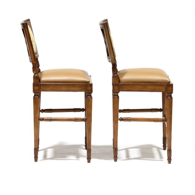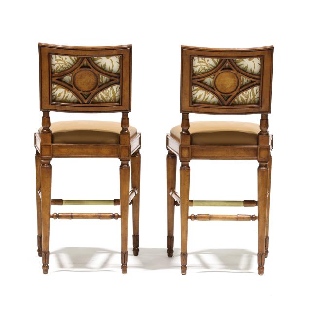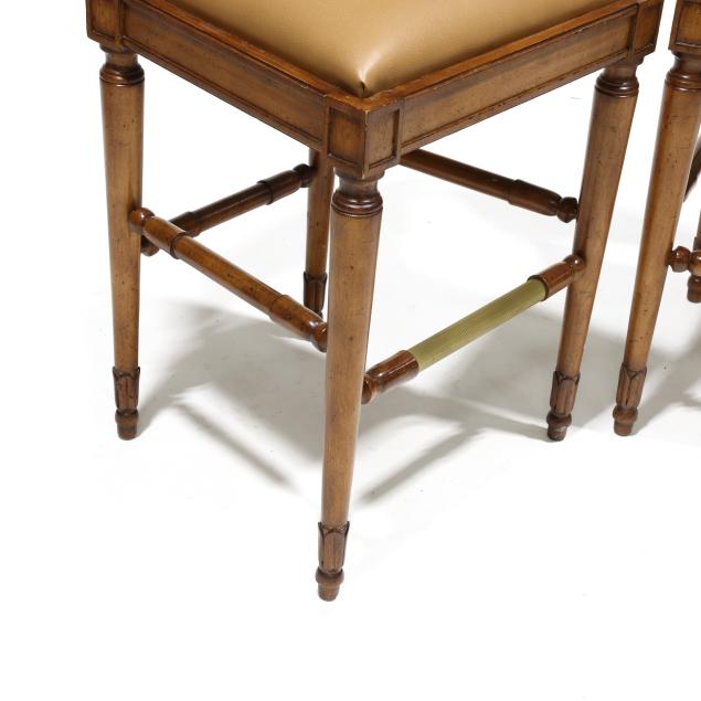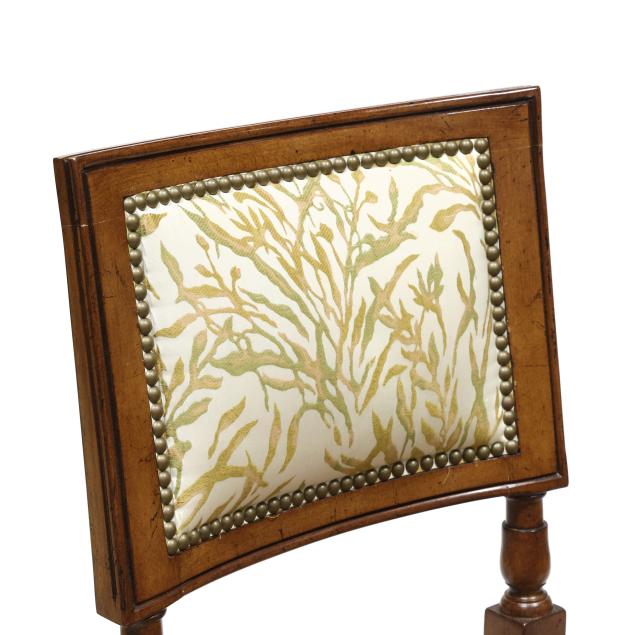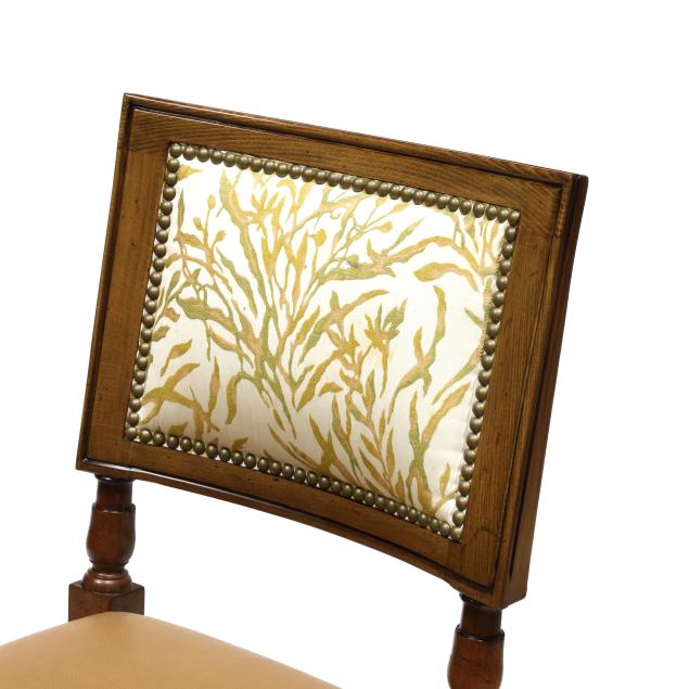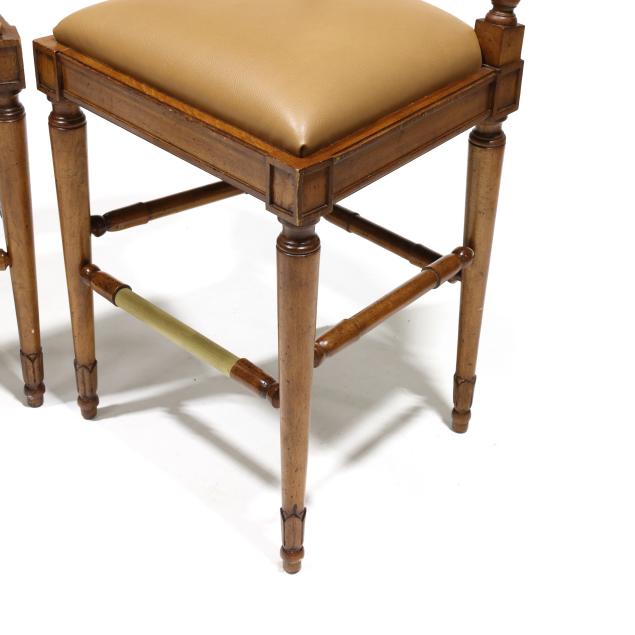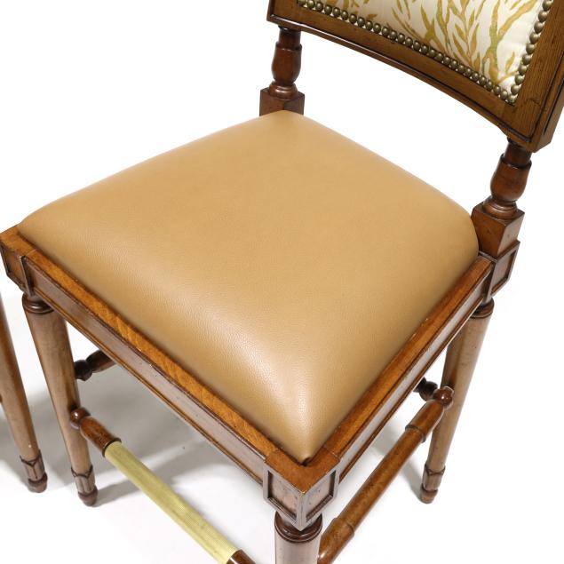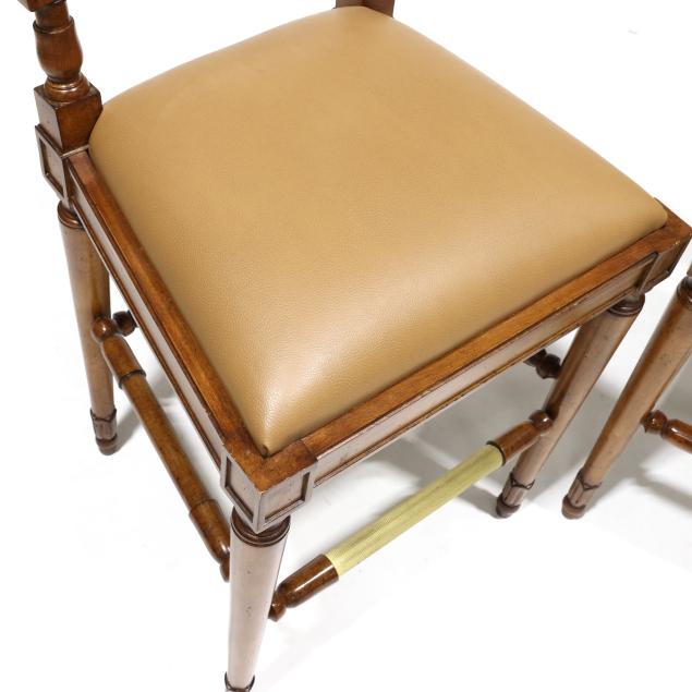 Contemporary, distressed mahogany frames, silk upholstered backs, tan leather seats, turned legs with brass foot-rail, labeled.